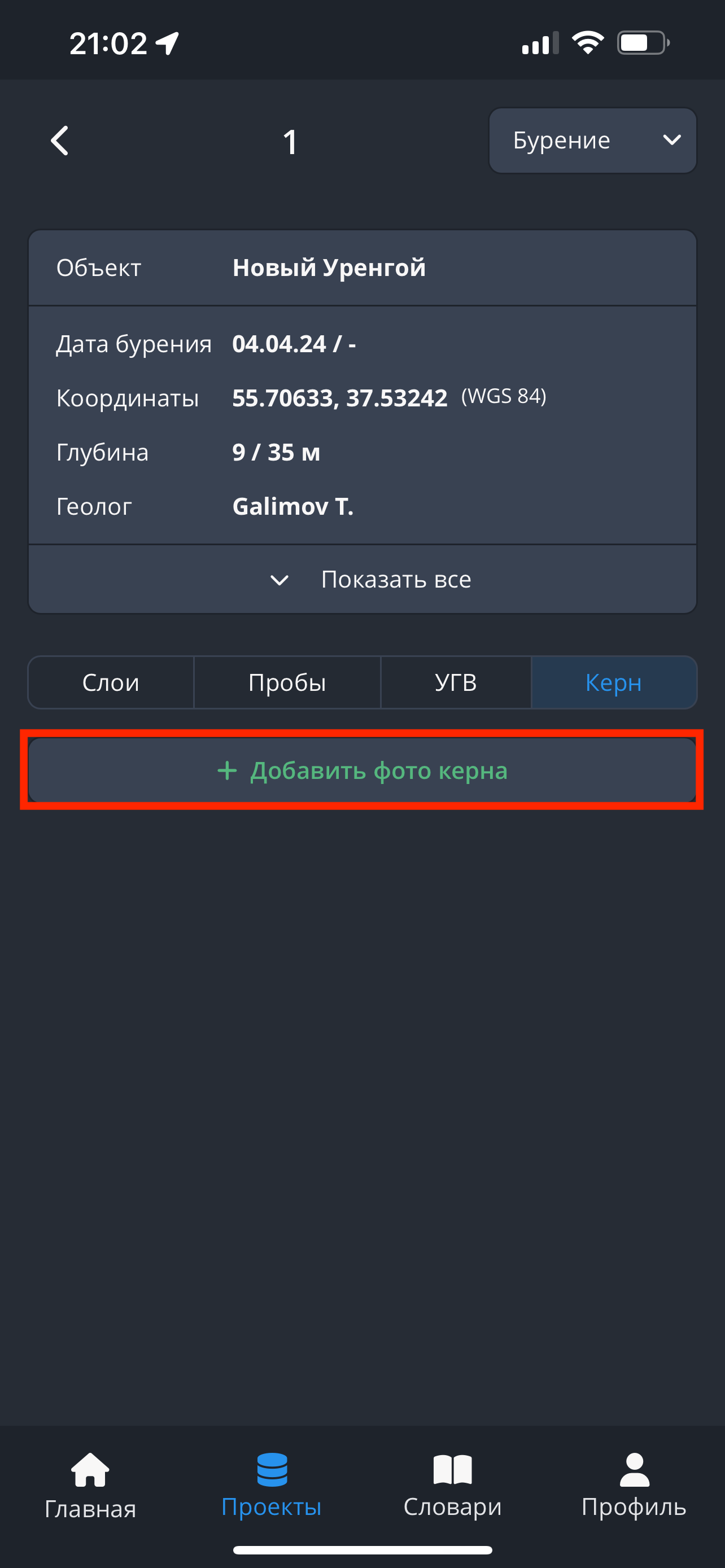 - Во вкладке “Фото керна” нажмите на кнопку "Добавить фото керна". Для добавления фотографий необходимо нажать кнопку «Загрузка фото», выбрать изображения из галереи устройства или сделать снимок.