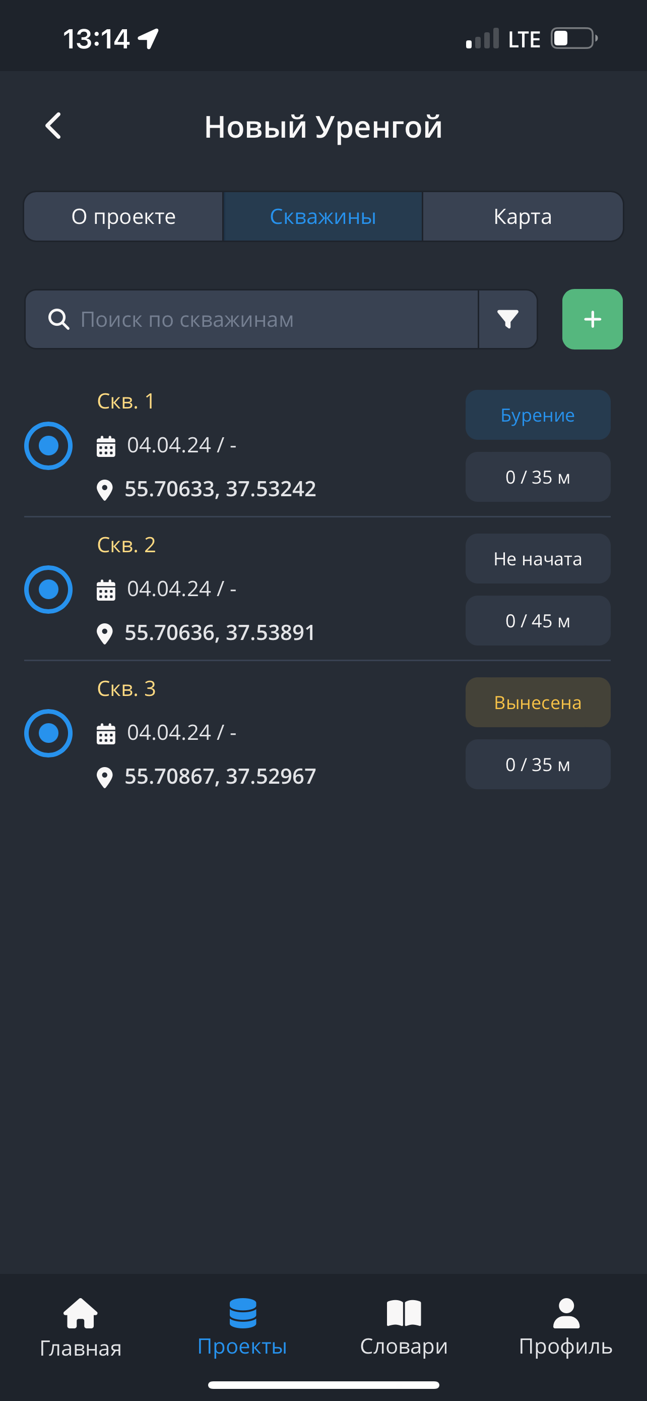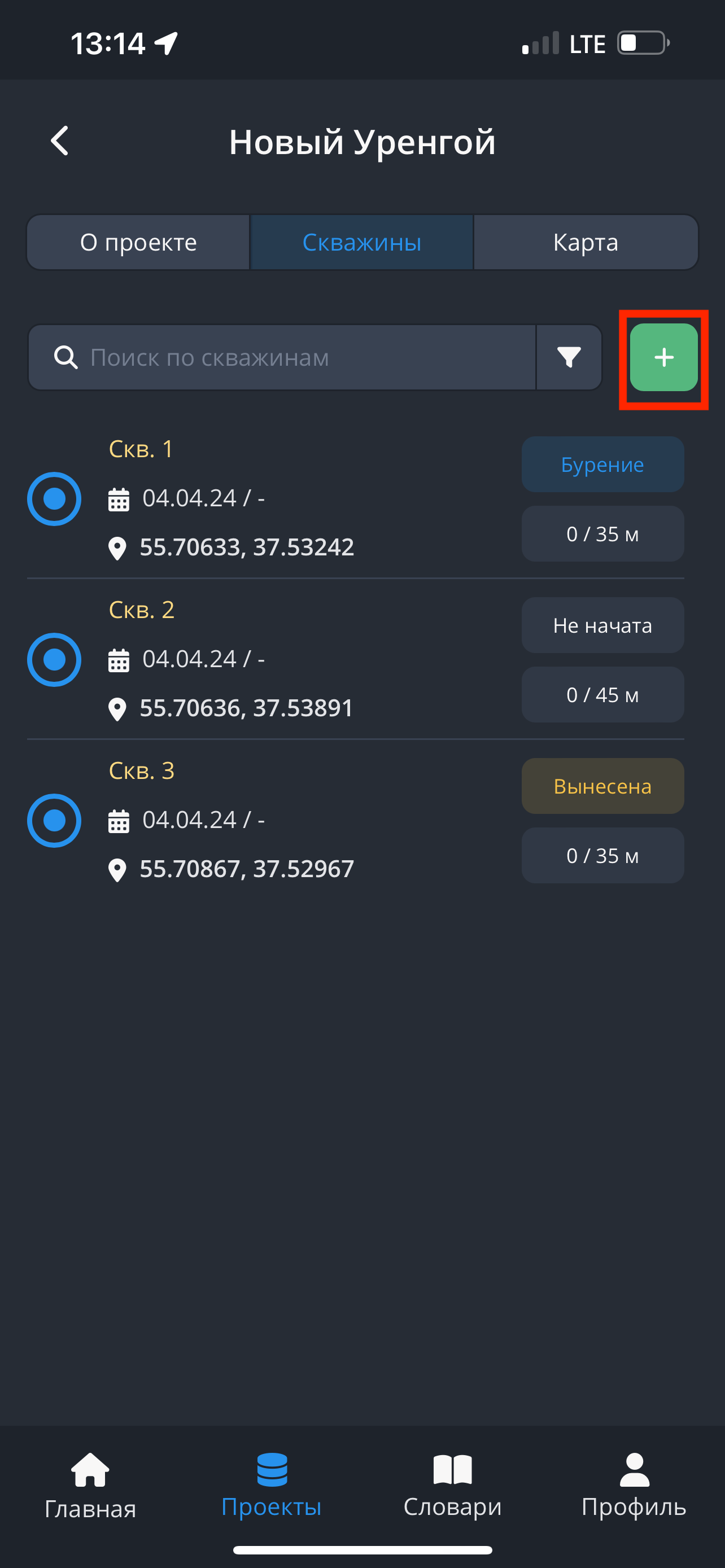 - Чтобы создать новую скважину в разделе "Скважины", нажмите на кнопку “+”.