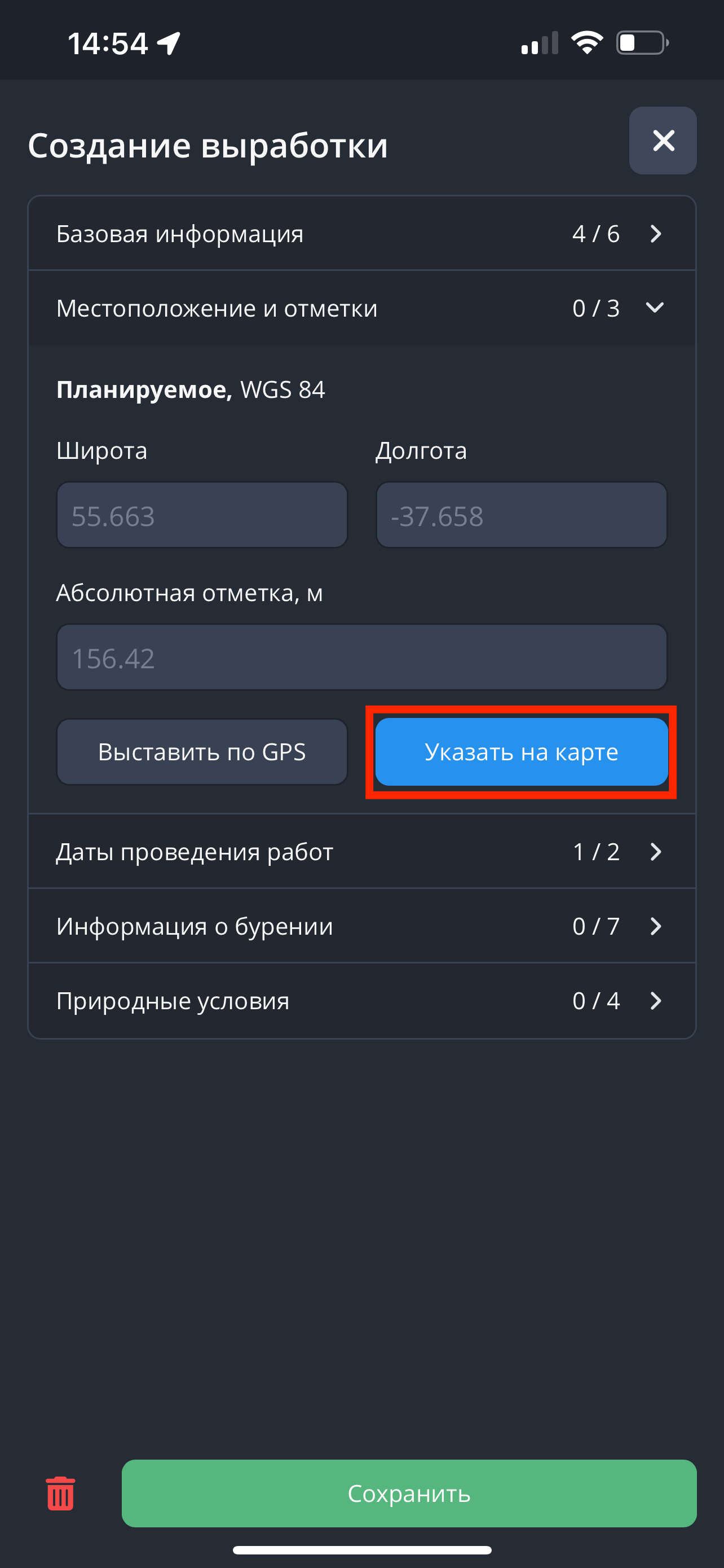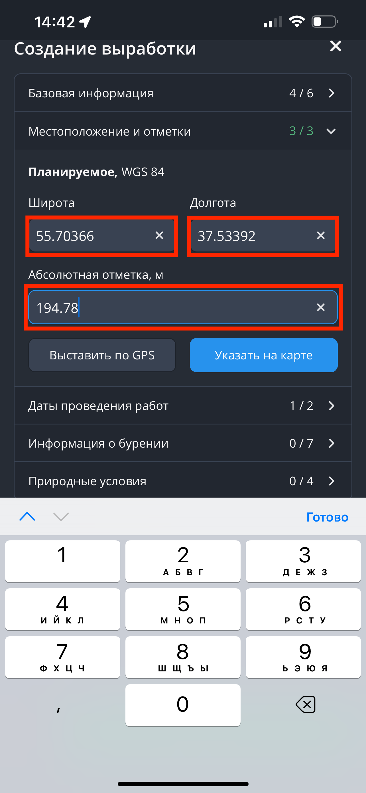 - Заполнить поля "Широта", "Долгота" и "Абсолютная отметка, м." вручную.