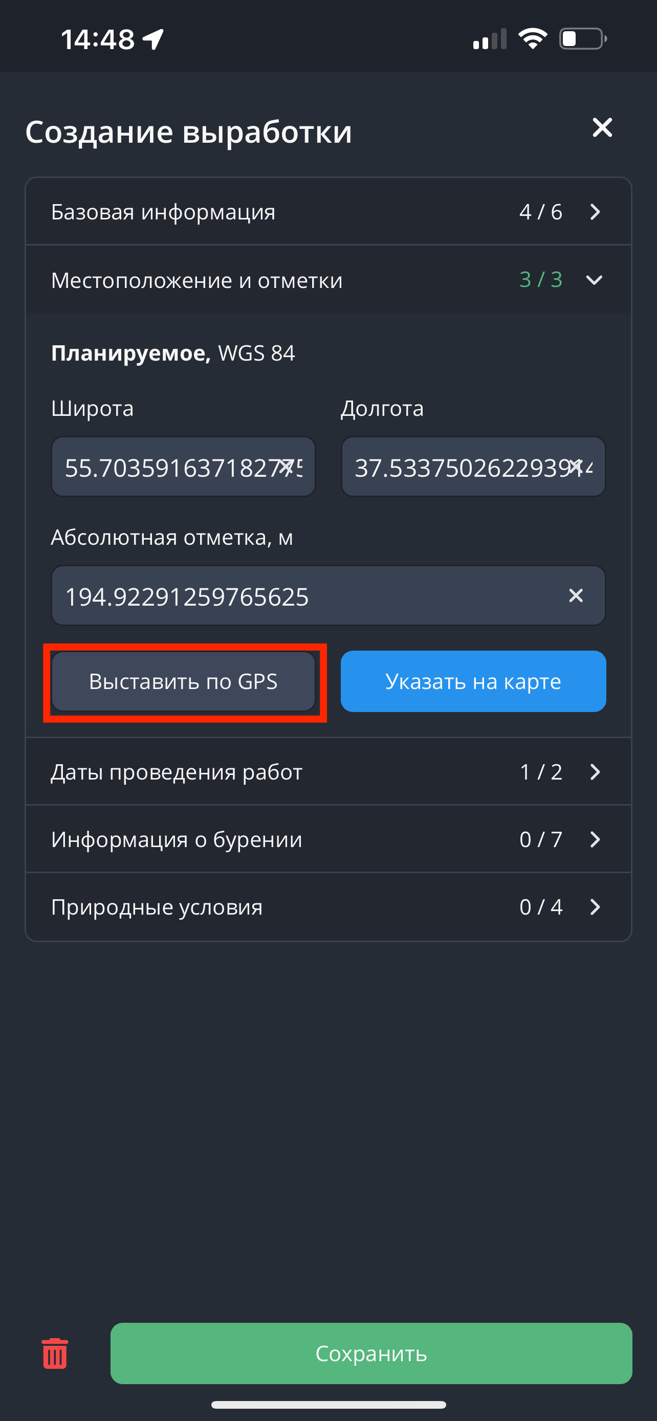 - Указать местоположение и абсолютную отметку с помощью GPS. Для этого необходимо нажать на кнопку "Выставить по GPS". Поля "Широта", "Долгота" и "Абсолютная отметка, м." заполнятся автоматически.