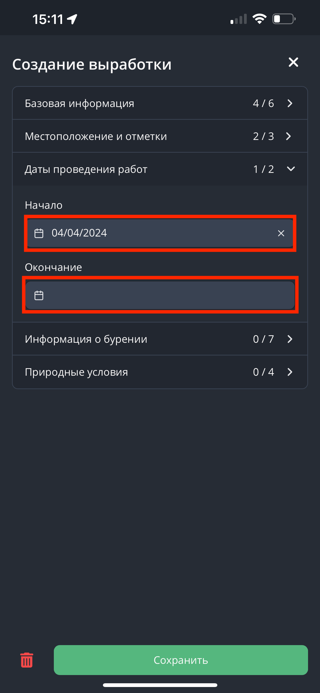 После заполнения информации о местоположении отметках перейдите в раздел "Даты проведения работ". Заполните поля "Начало" и "Окончание".