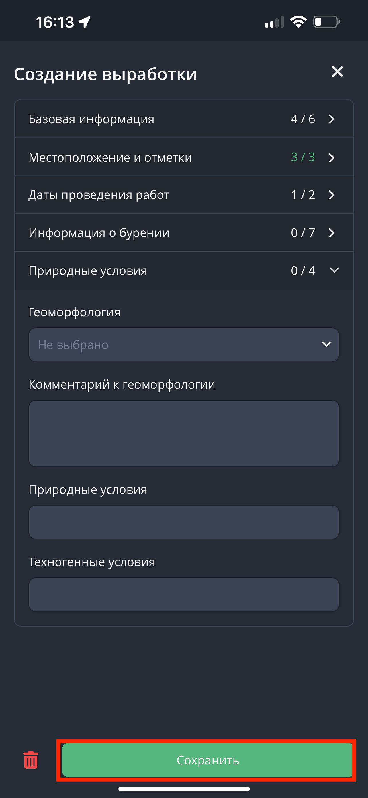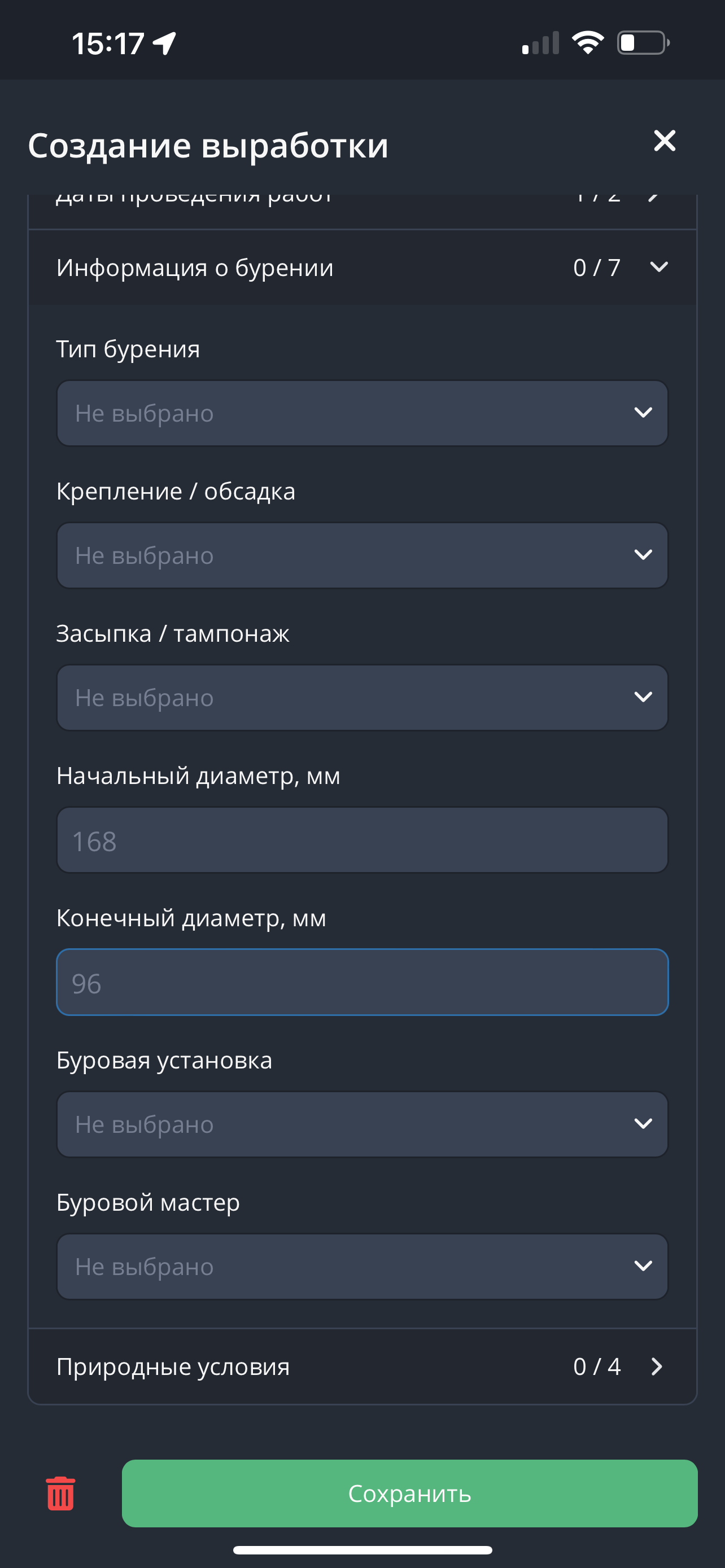 - После заполнения информации о бурении перейдите в раздел "Природные условия". Добавьте информацию о природных и техногенных особенностях места проведения буровых работ.
