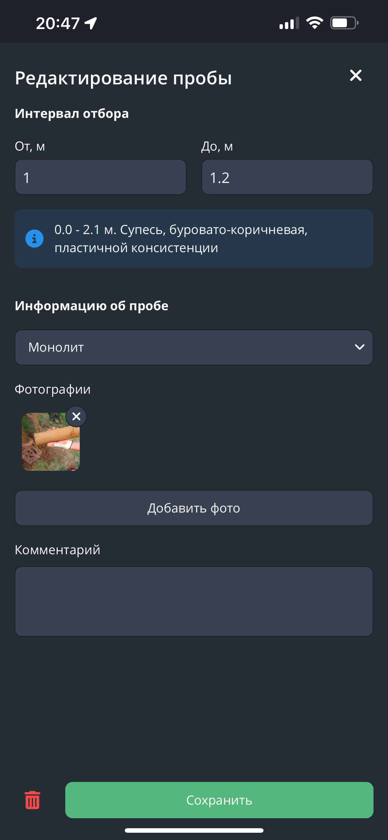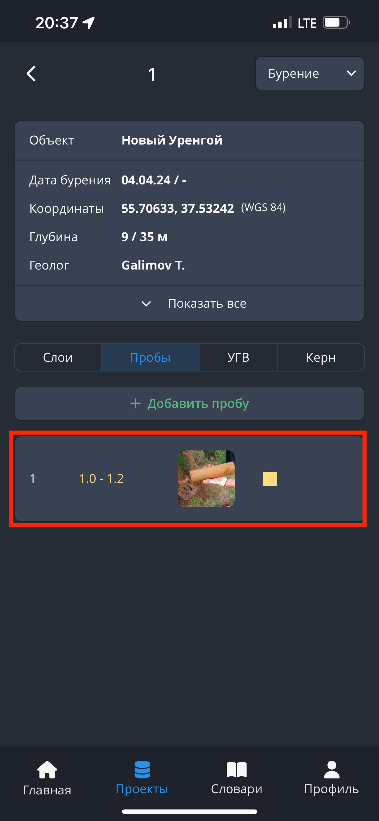- При добавлении пробы укажите глубину отбора (не может превышать суммарную глубину слоев), тип пробы.