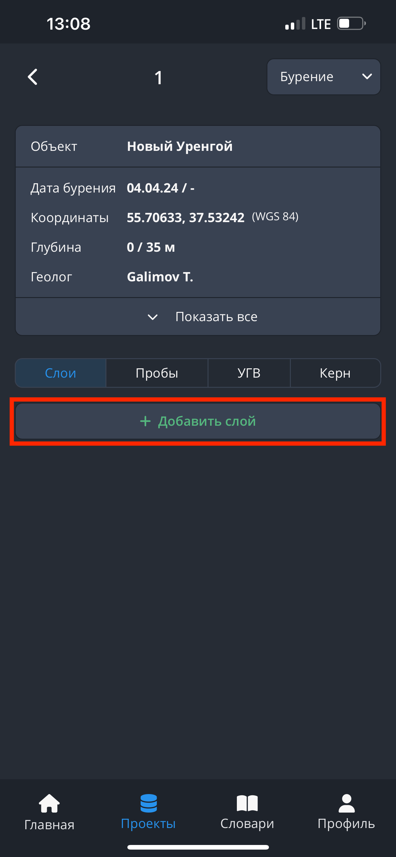 - В приложении Soilbox невозможно добавление слоёв, проб, УГВ и керна в скважины со статусом “Не начата”. Для того, чтобы добавить данные инженерно-геологических скважин, необходимо изменить статус выработки.