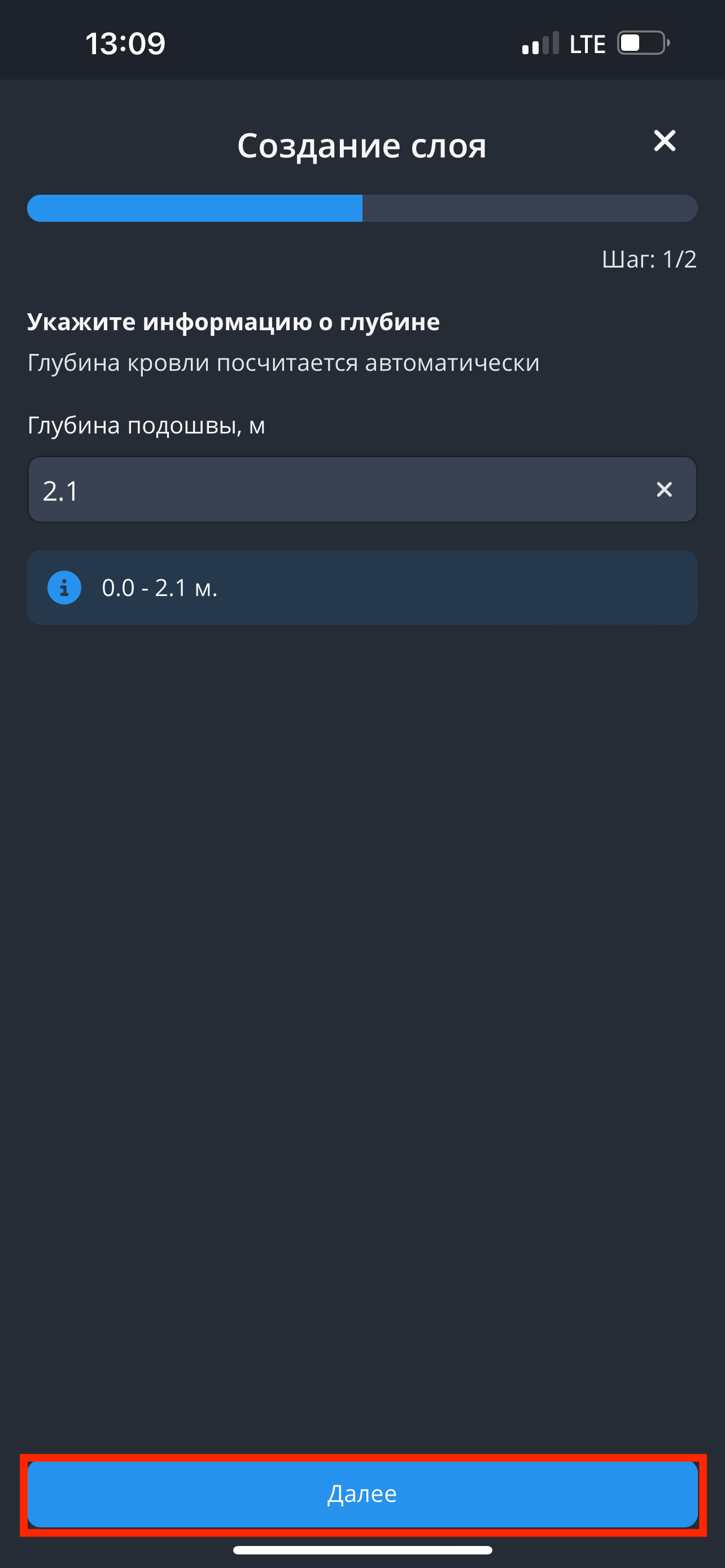 - Для начала описания слоев нажмите на кнопку "Добавить слой" и укажите глубину подошвы, затем нажмите на кнопку "Далее".