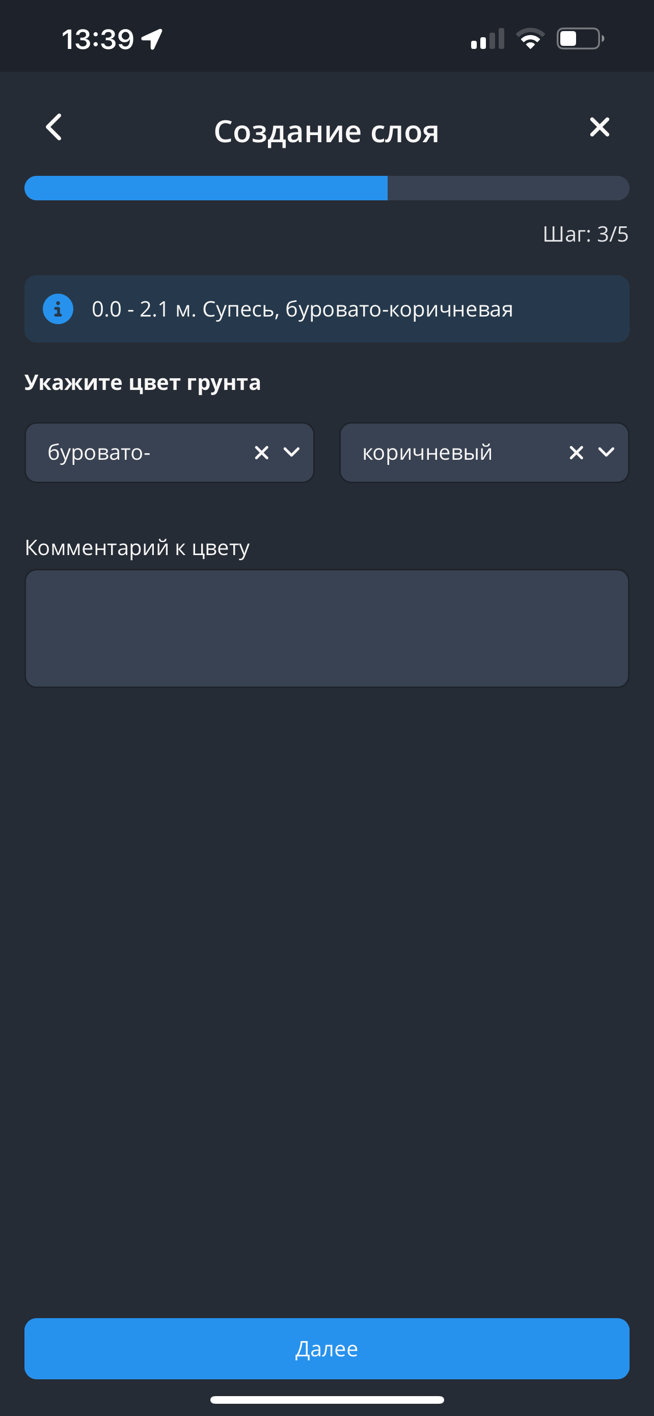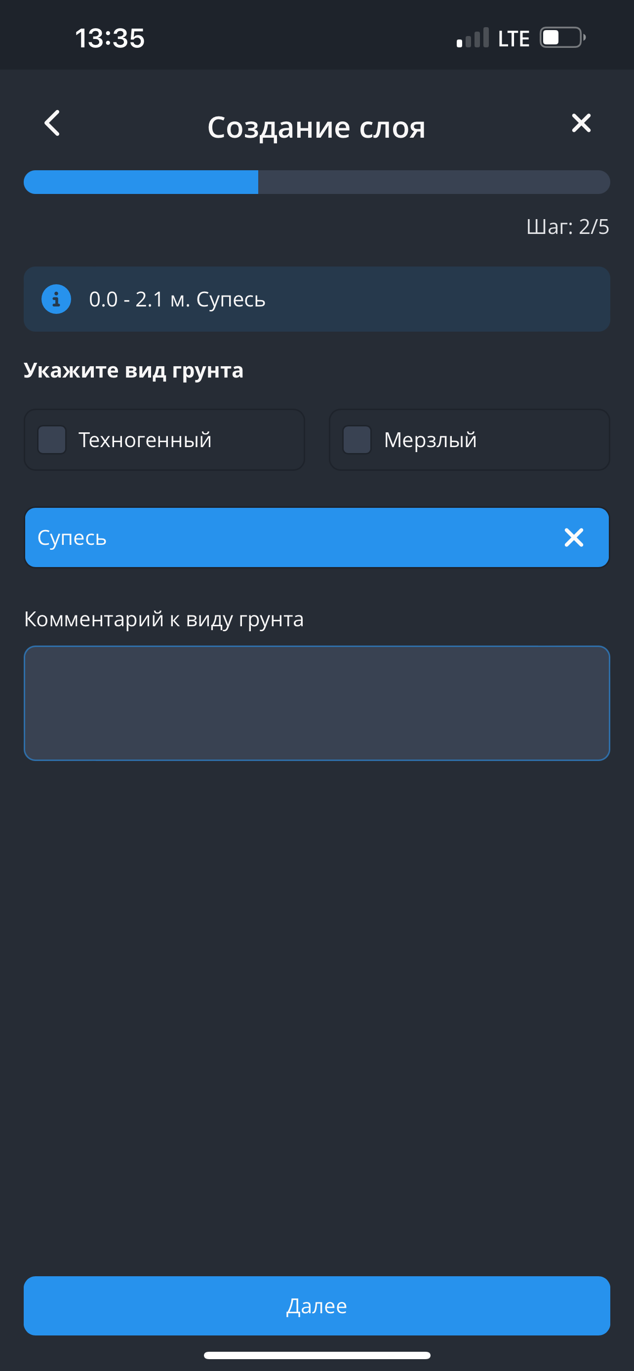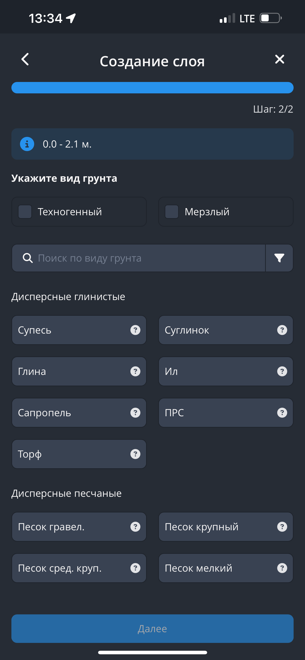- Далее выберите тип грунта. При выборе грунта остальные варианты выбора свернутся. Затем нажмите на кнопку "Далее".