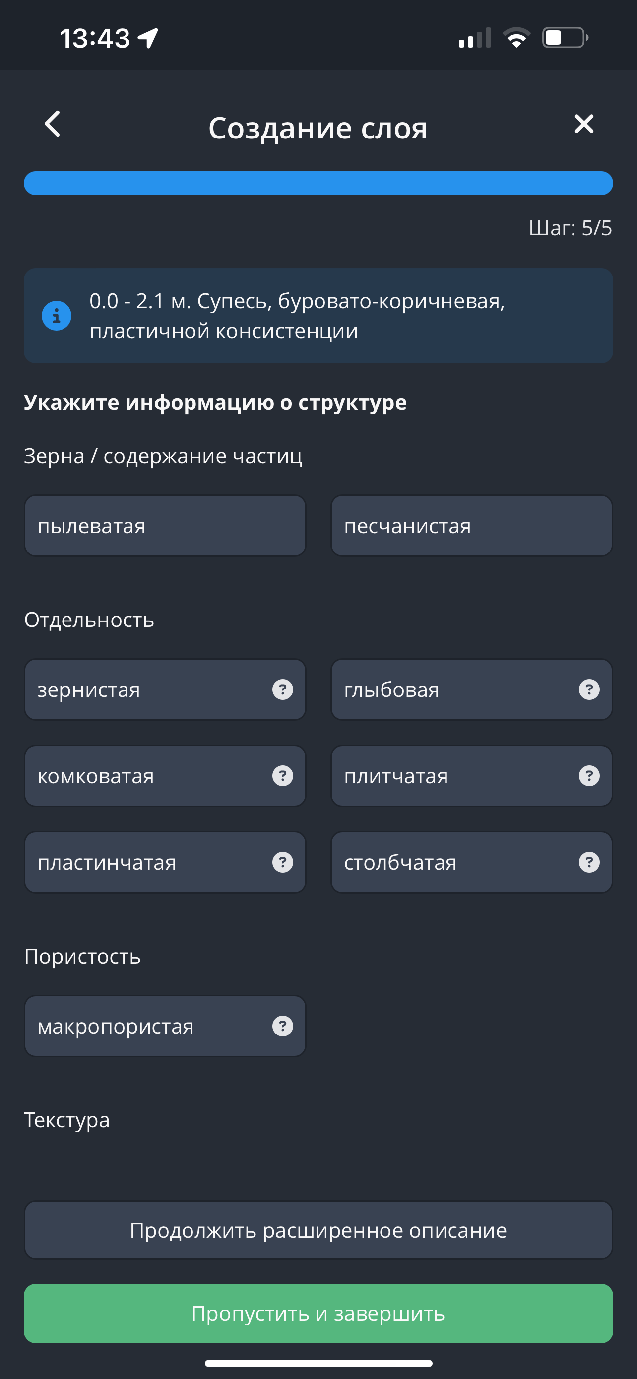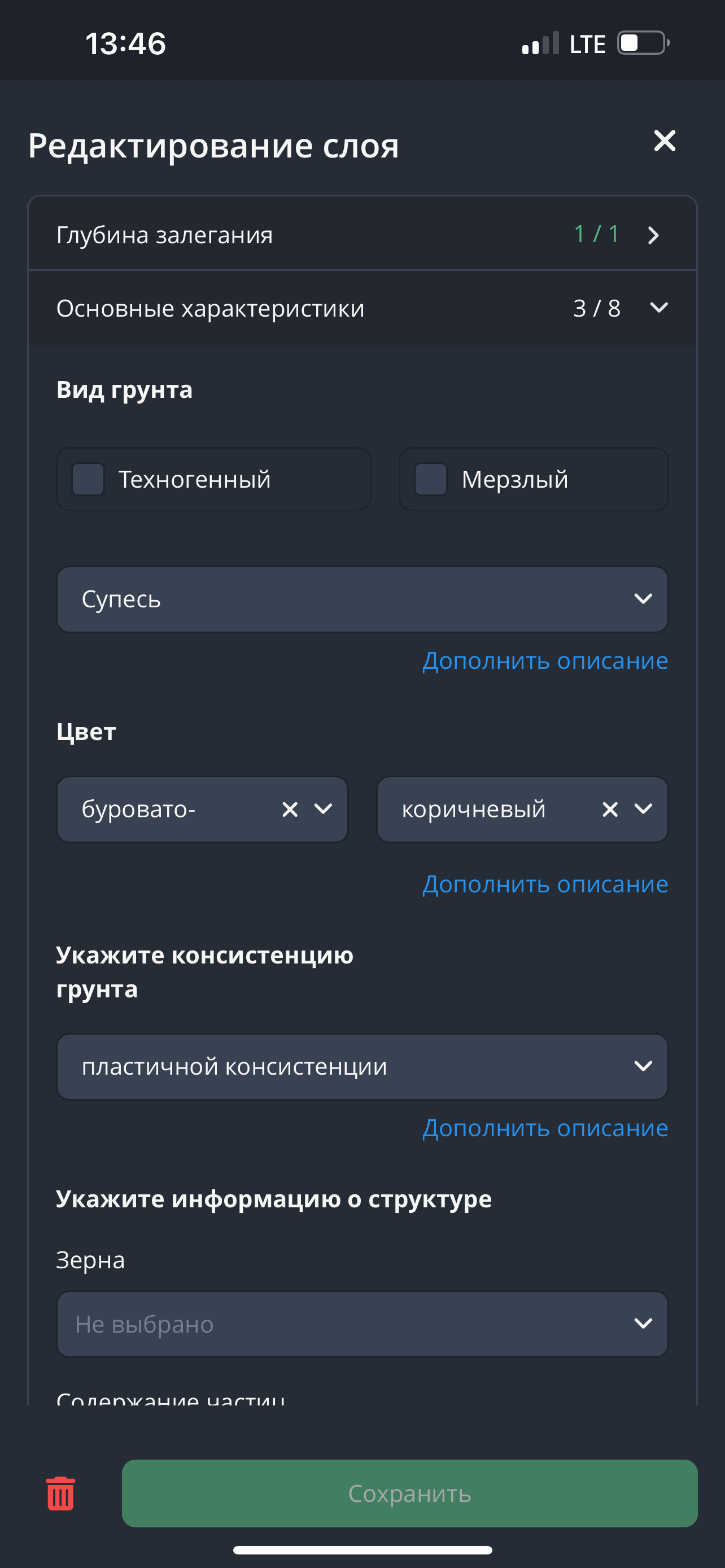 - Всё послойное описание собрано в уникальную для каждого класса грунтов последовательность описываемых характеристик - “Гид описания”. К каждой характеристике есть возможность добавить комментарий в свободной форме. Опции в выпадающих списках также подстраиваются под разновидность грунта. Одновременно с выбором опций на экране появляется текст полного описания грунта.