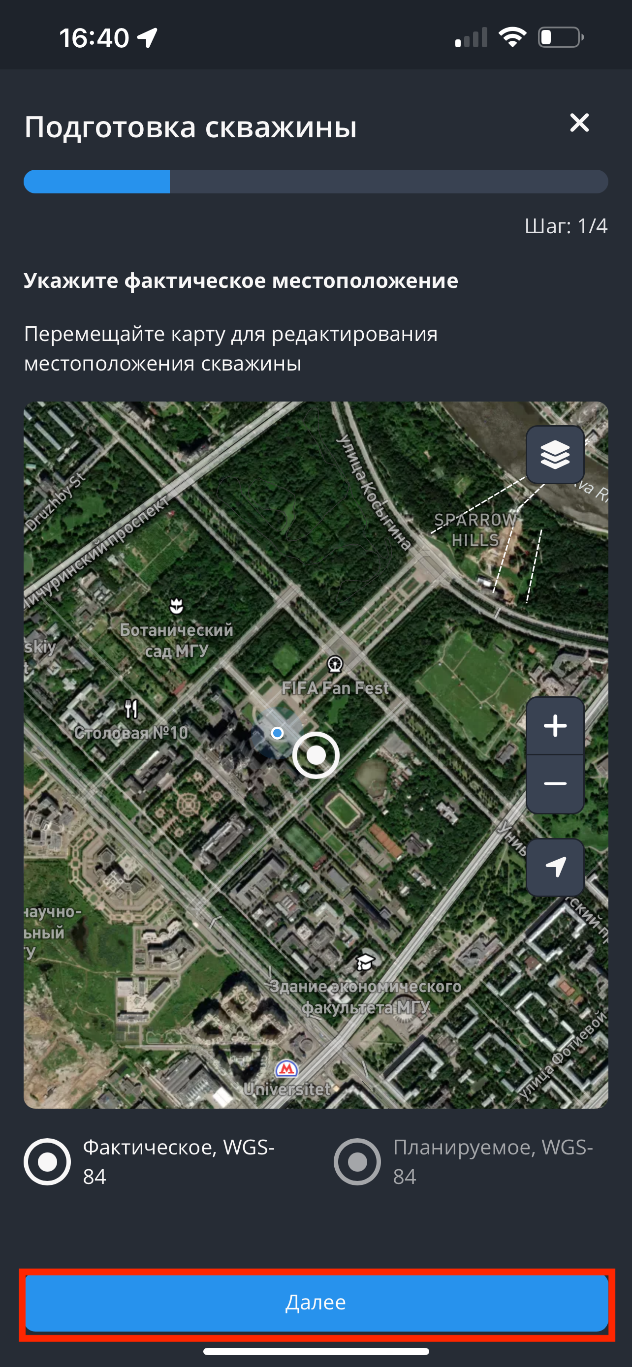 Далее необходимо выполнить предлагаемые шаги по подготовке скважины. На данном этапе требуется указать фактическое местоположение выработки и нажать кнопку «Далее».