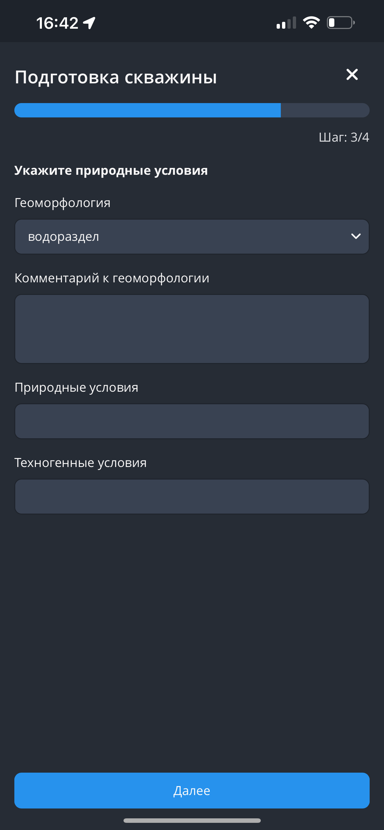 - Укажите информацию о бурении, затем нажмите на кнопку "Далее".