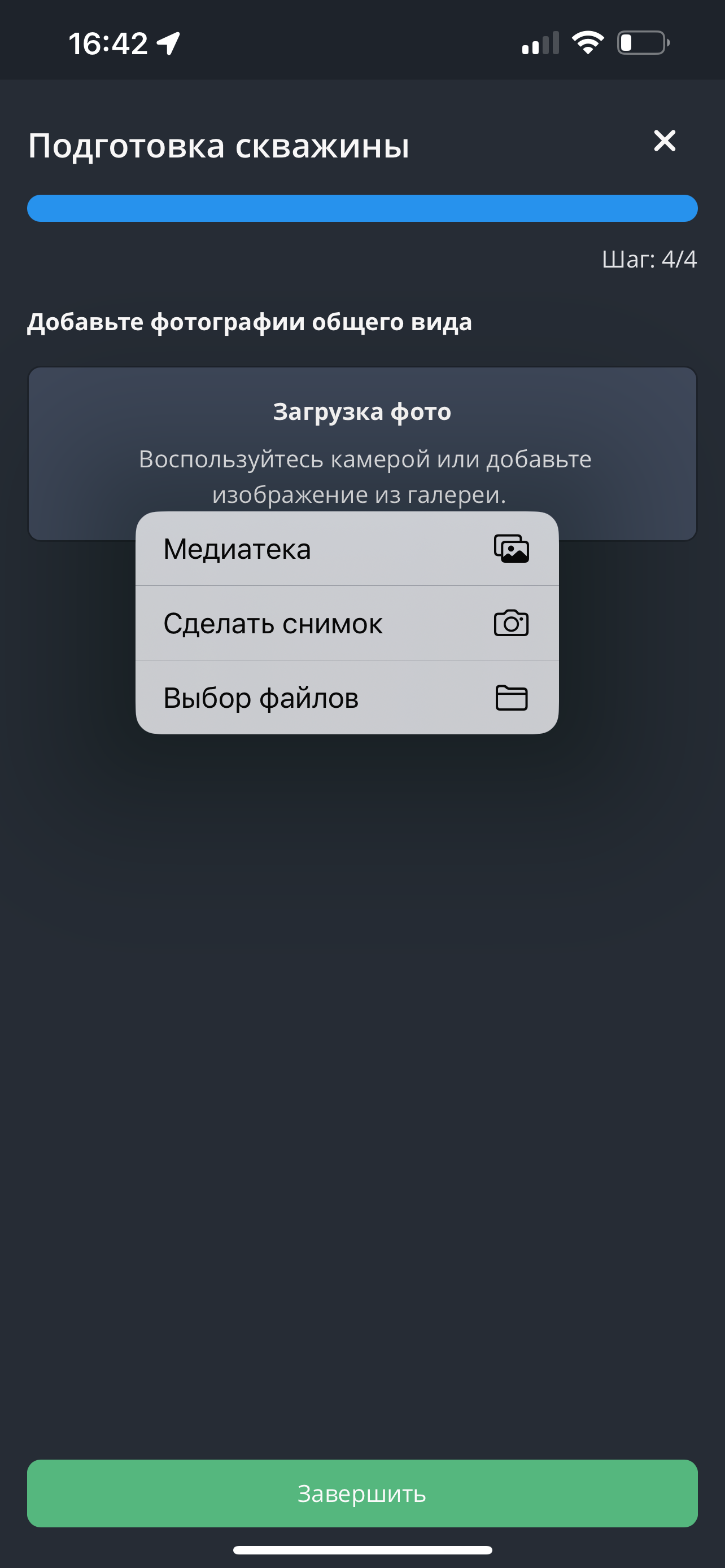 - Загрузите фотографии общего вида скважины. Для добавления фотографий необходимо нажать на кнопку «Загрузка фото», выбрать изображения из галереи устройства или сделать снимок. Раздел “Фотографии” позволяет пользователю загрузить несколько фото. Нажмите на кнопку "Завершить".
