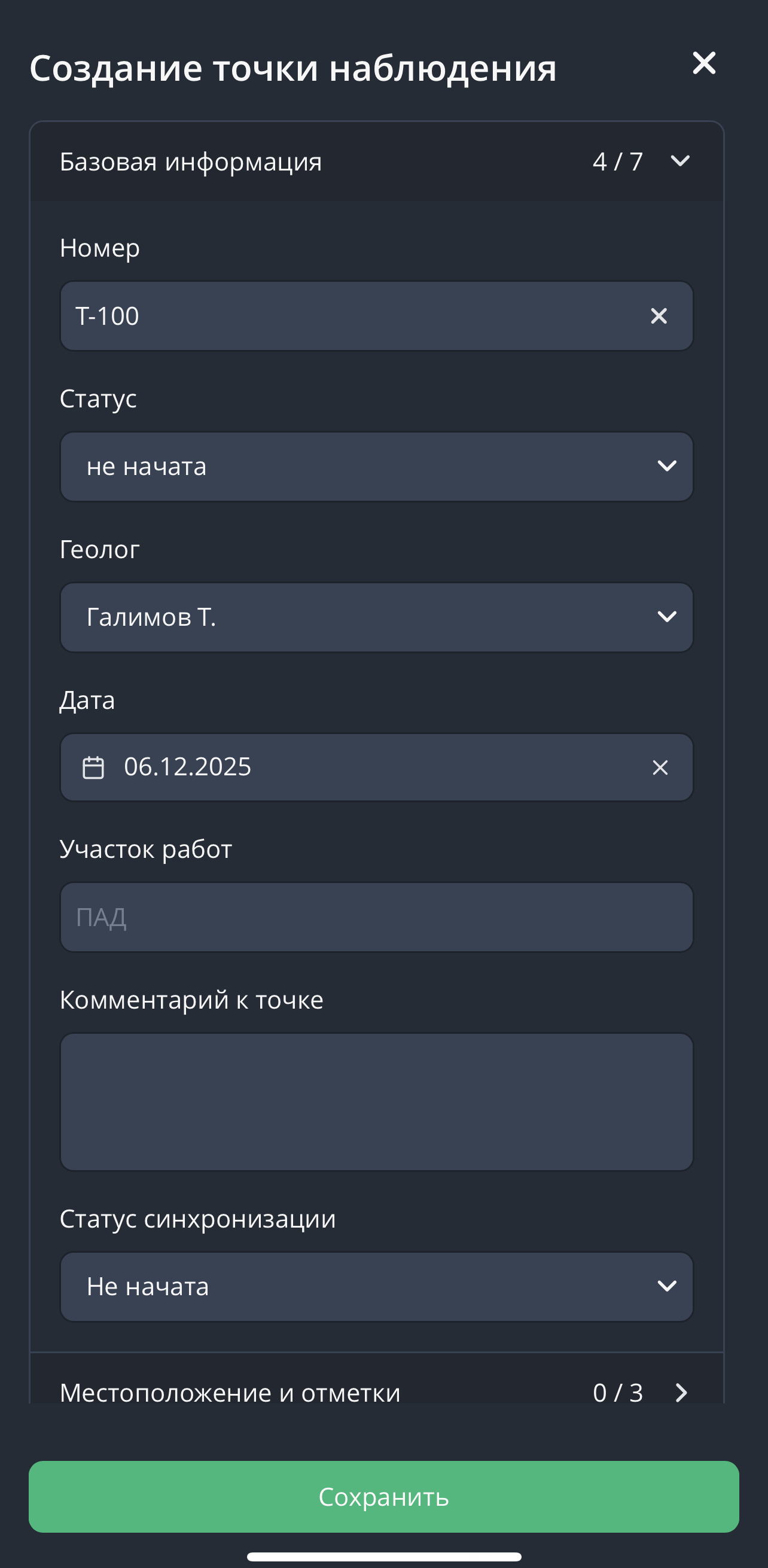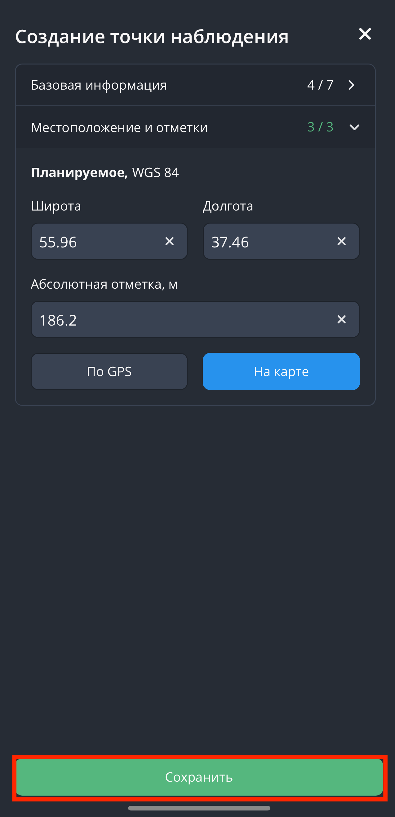 Указать на карте — выберите местоположение точки на карте и сохраните координаты. Поля «Широта» и «Долгота» заполняются автоматически, абсолютная отметка, м указывается вручную.