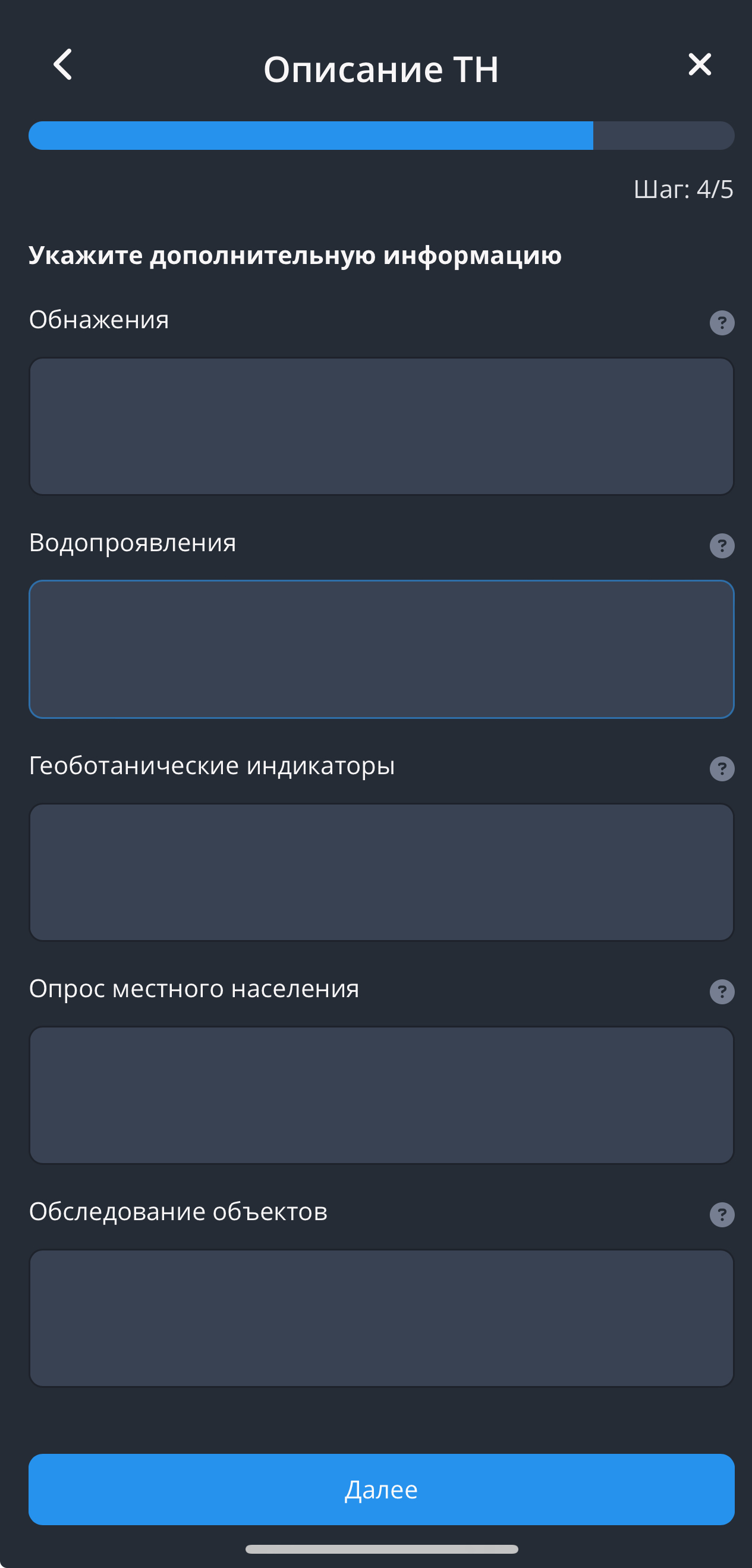 - Укажите дополнительную информацию: обнажения, водопроявления, геоботанические индикаторы, данные опроса местного населения, обследование объектов и комментарий к точке. Затем нажмите на кнопку «Далее».