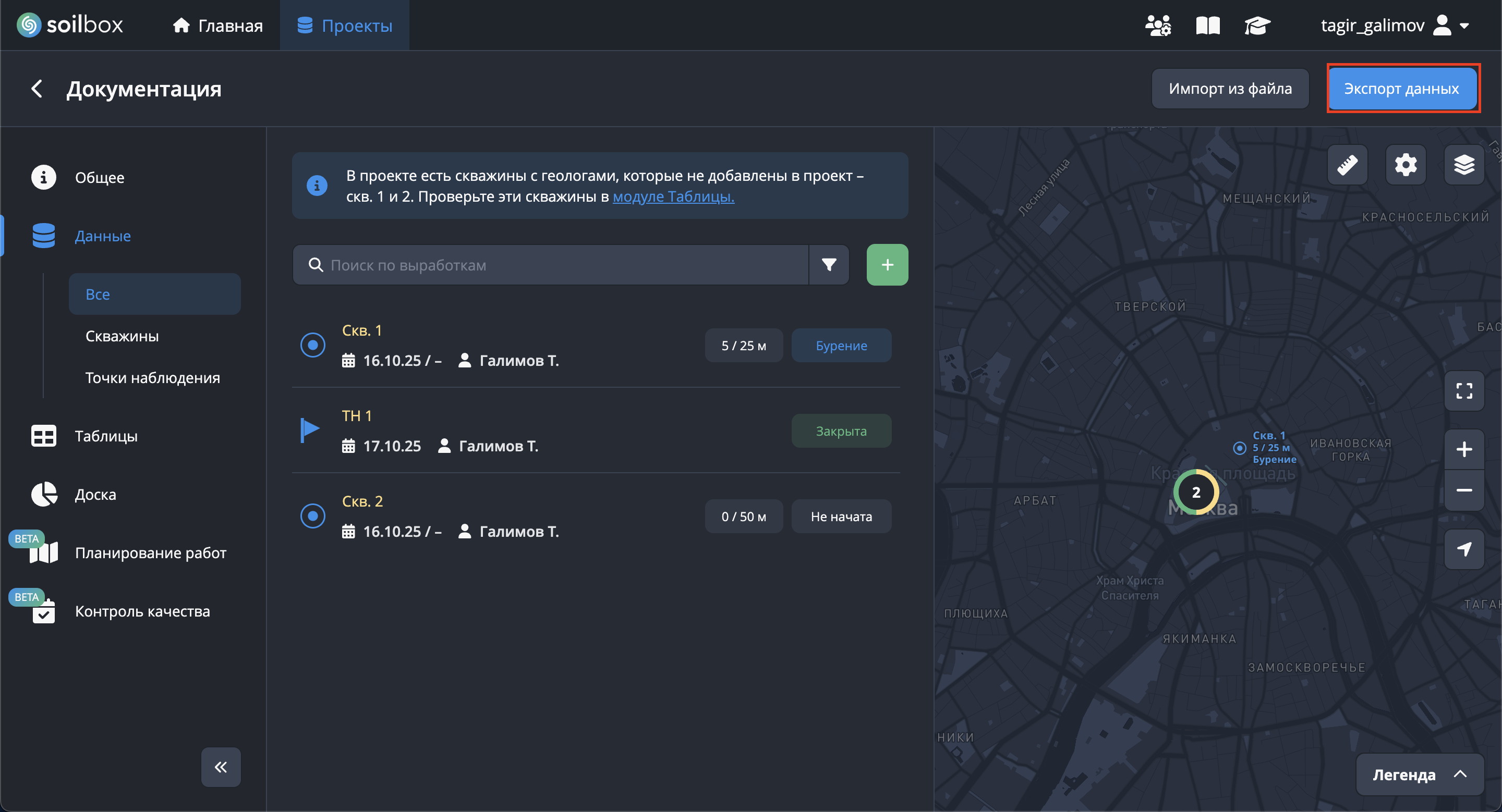 Для экспорта данных перейдите на страницу проекта и нажмите на кнопку "Экспорт данных", расположенную в правой части страницы.