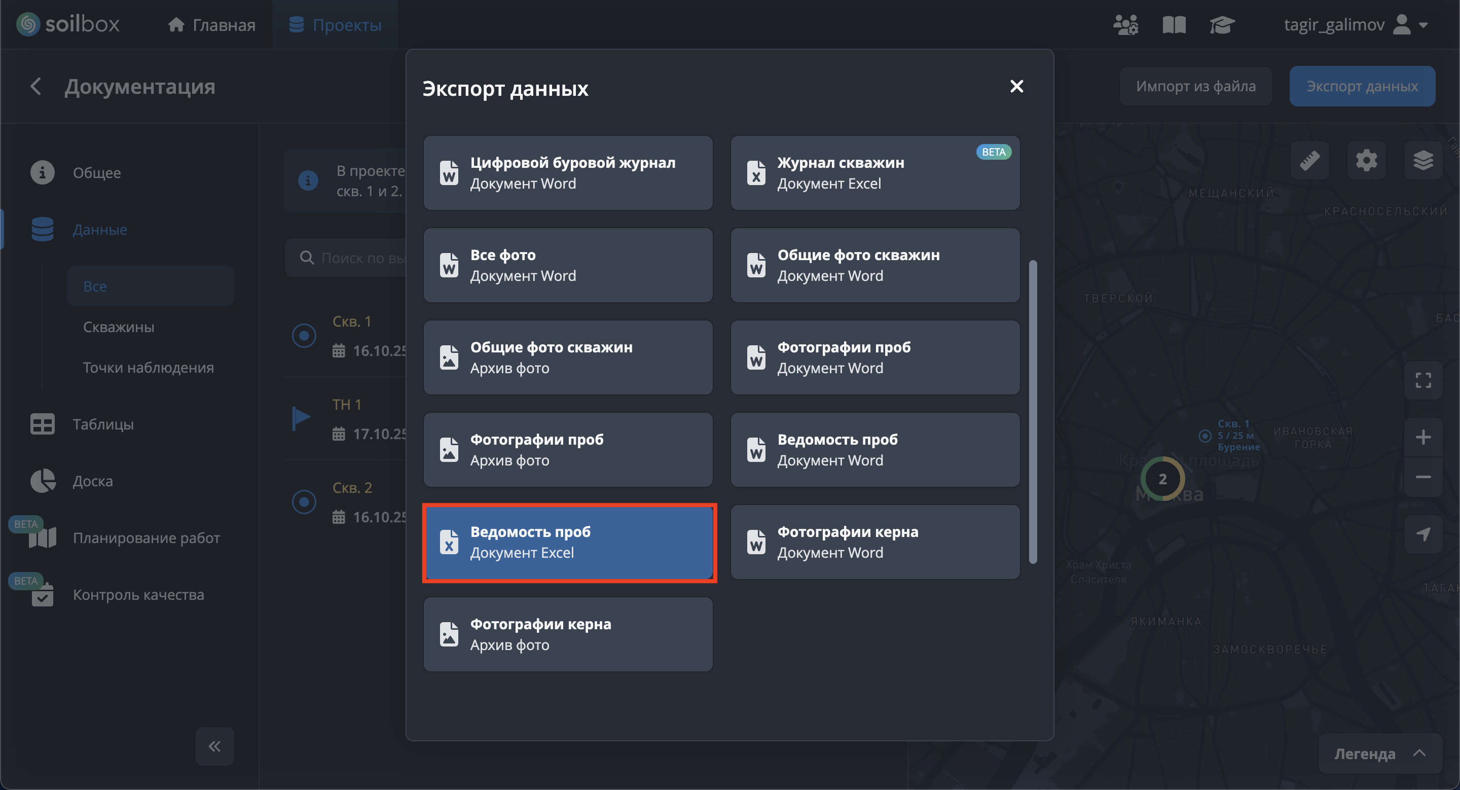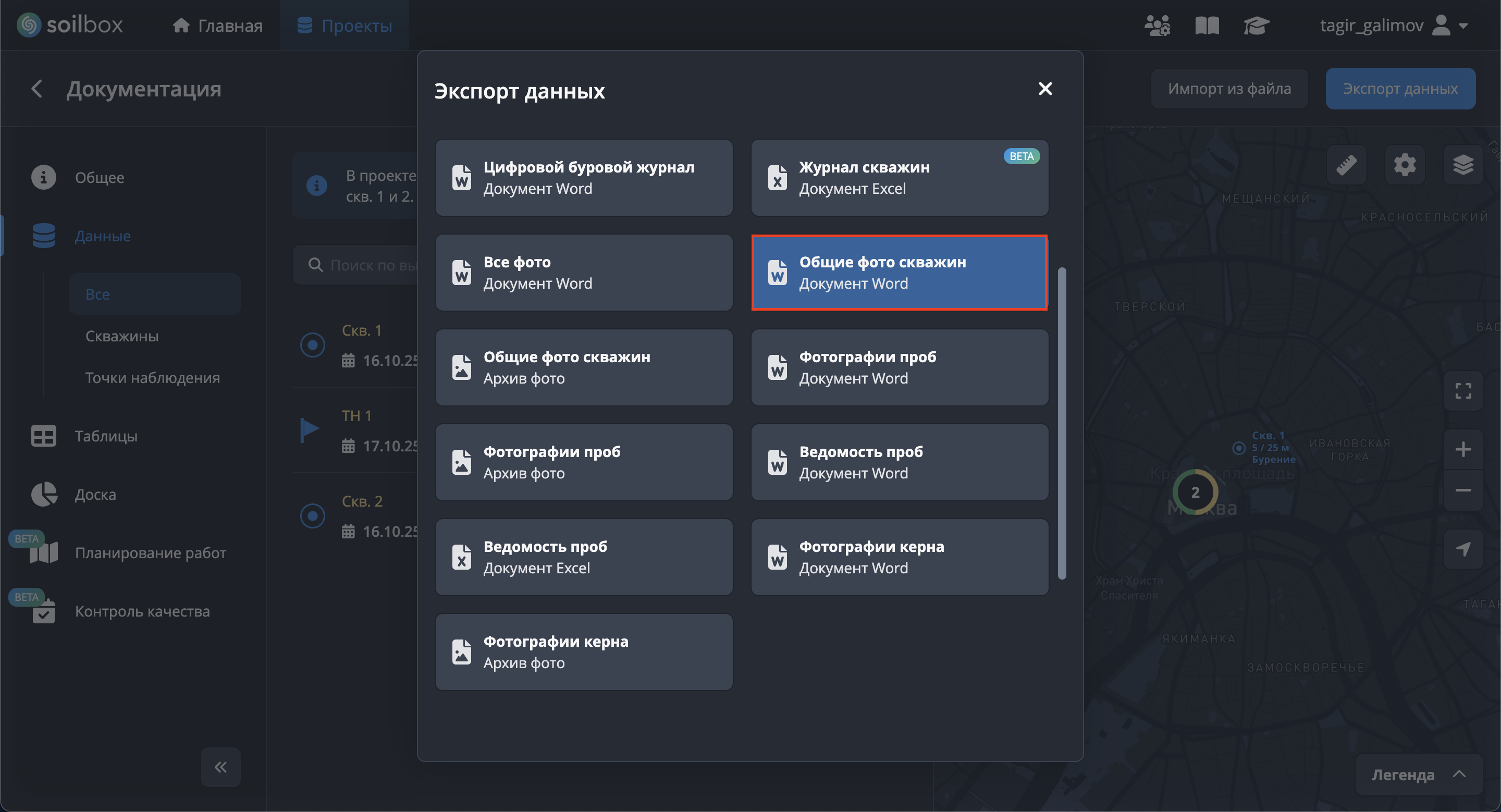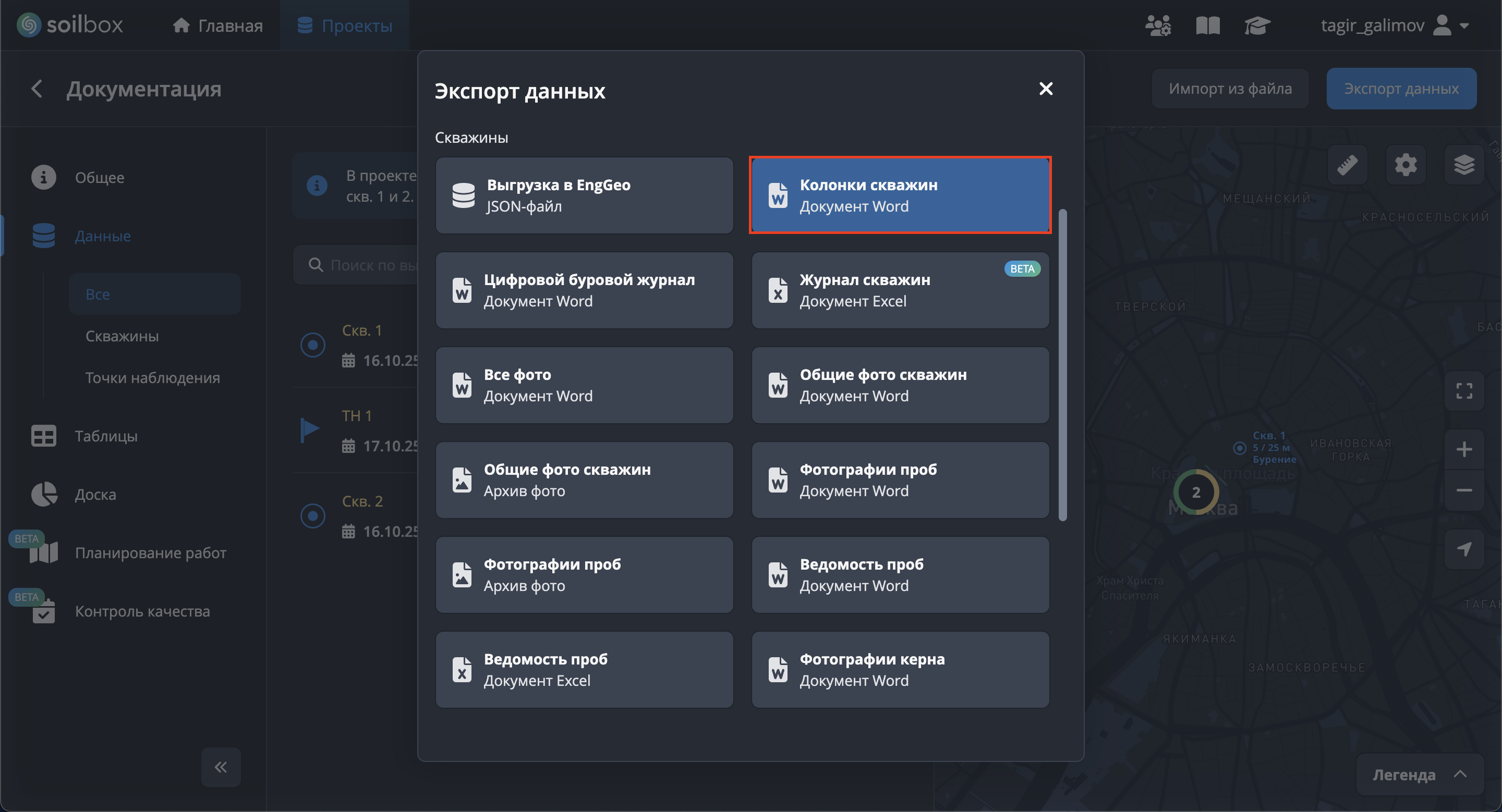 - Нажмите "Выбрать скважины для экспорта", отметьте скважины → "Применить".