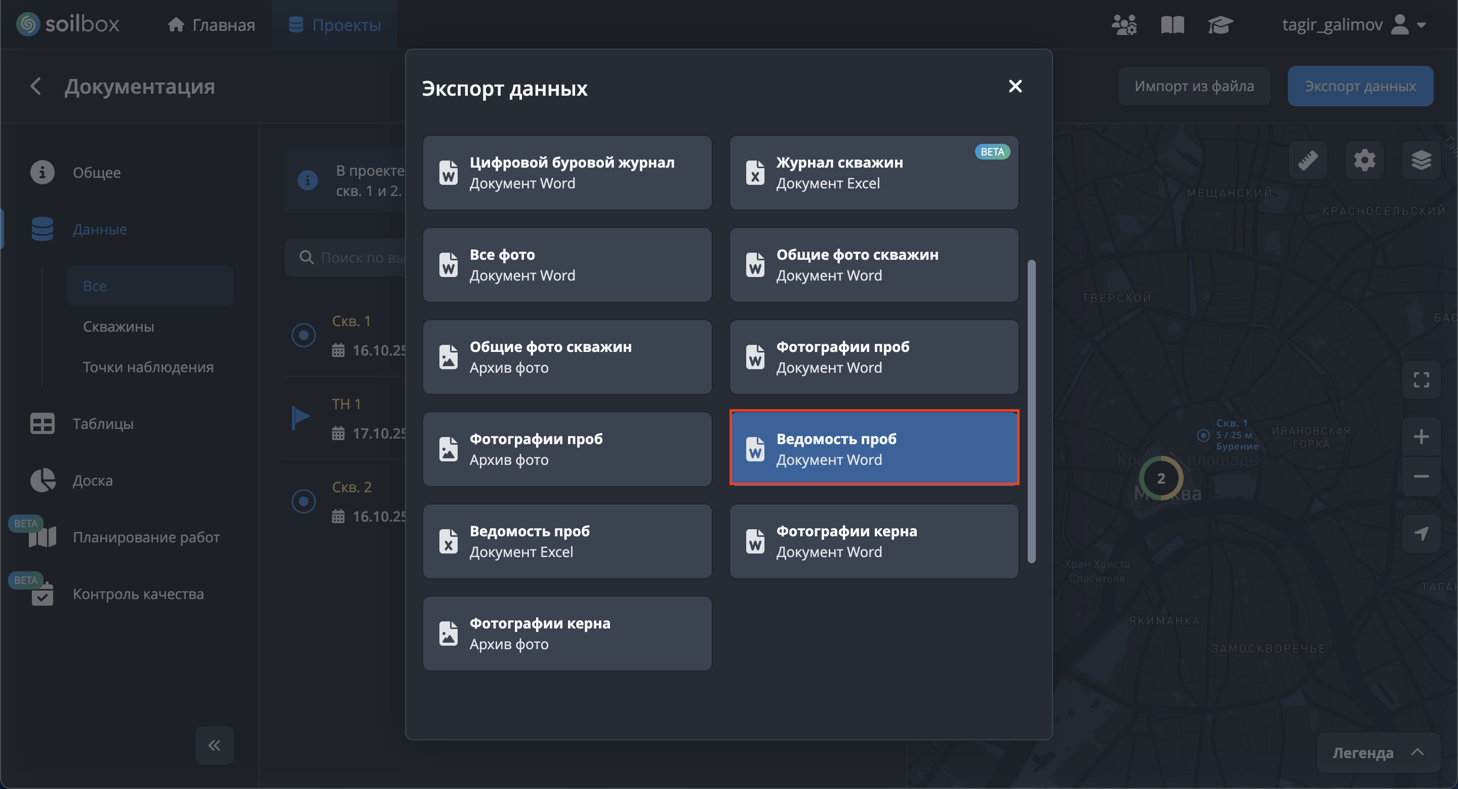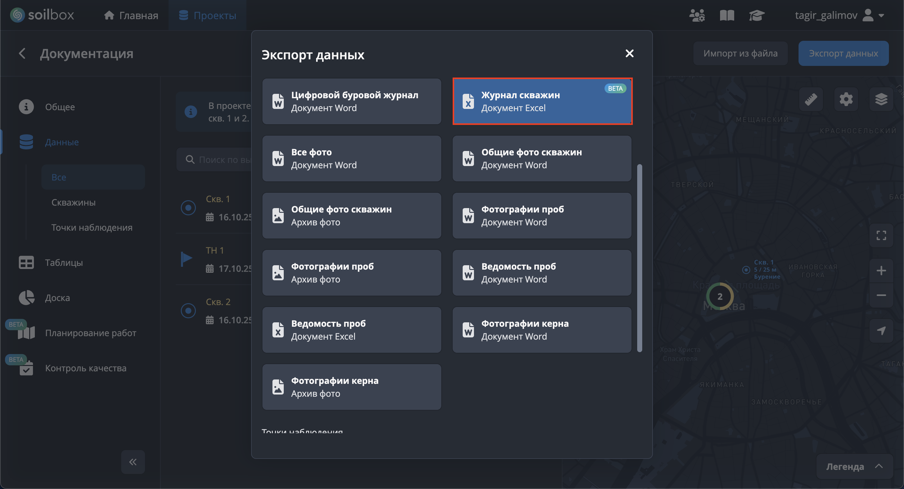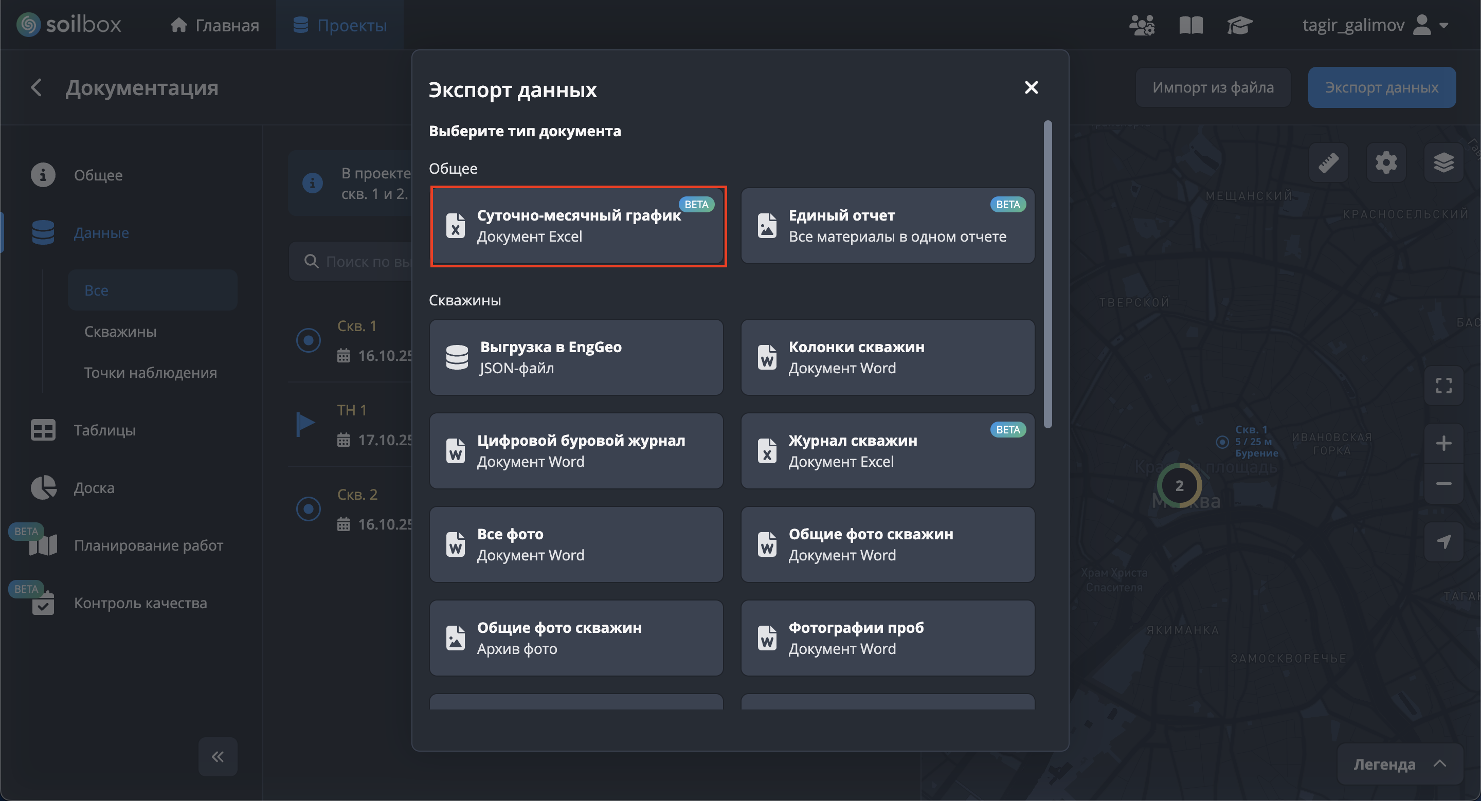 - Нажмите "Выбрать скважины для экспорта", отметьте скважины → "Применить".