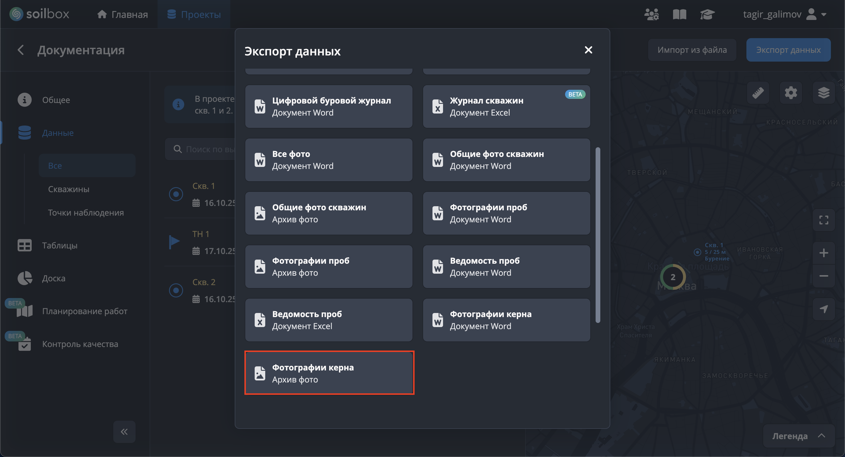 Для экспорта фото керна обязателен выбор скважин.