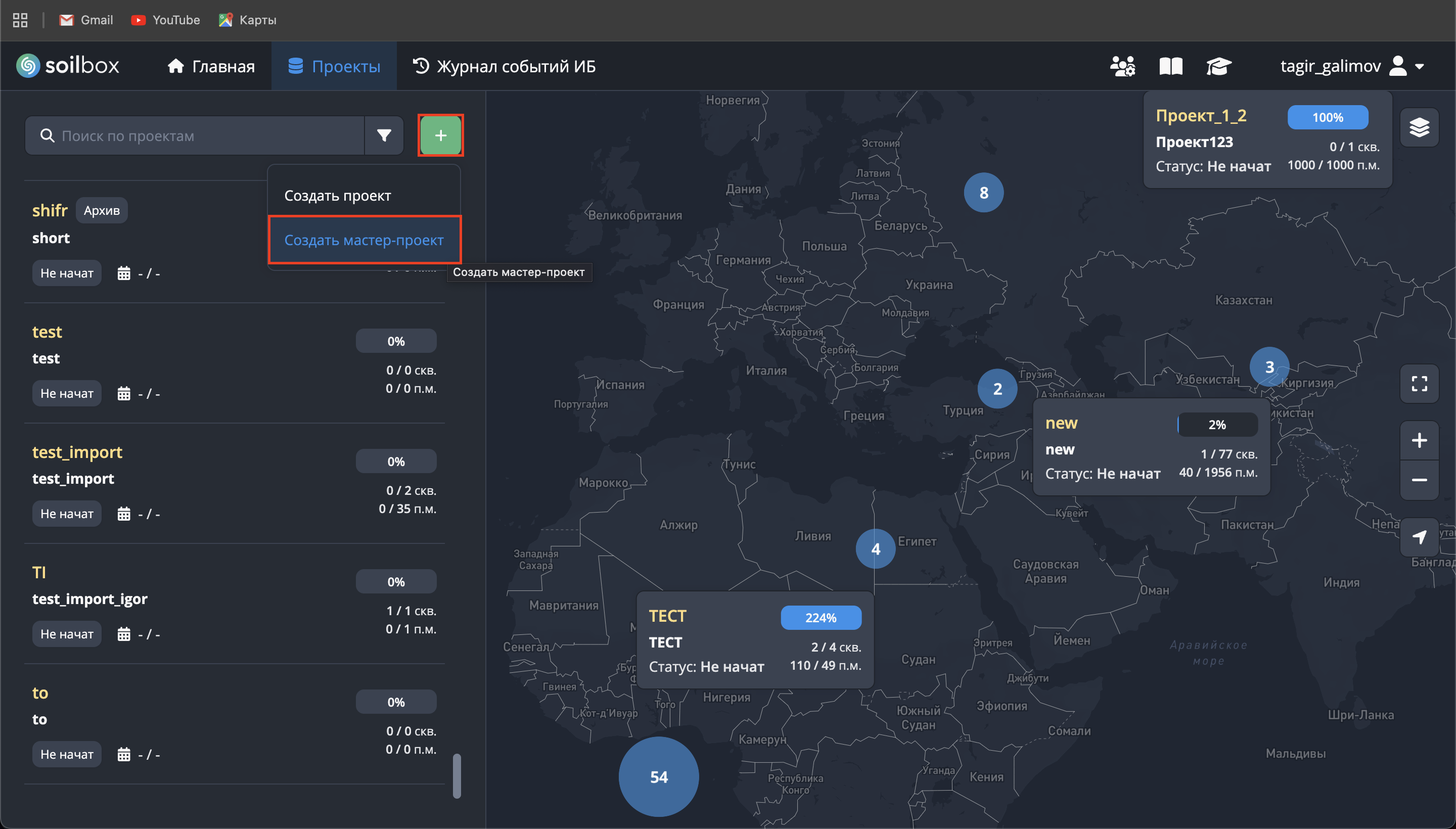- Перейдите в раздел «Проекты» и нажмите кнопку «+». В выпадающем меню выберите пункт «Создать мастер-проект».