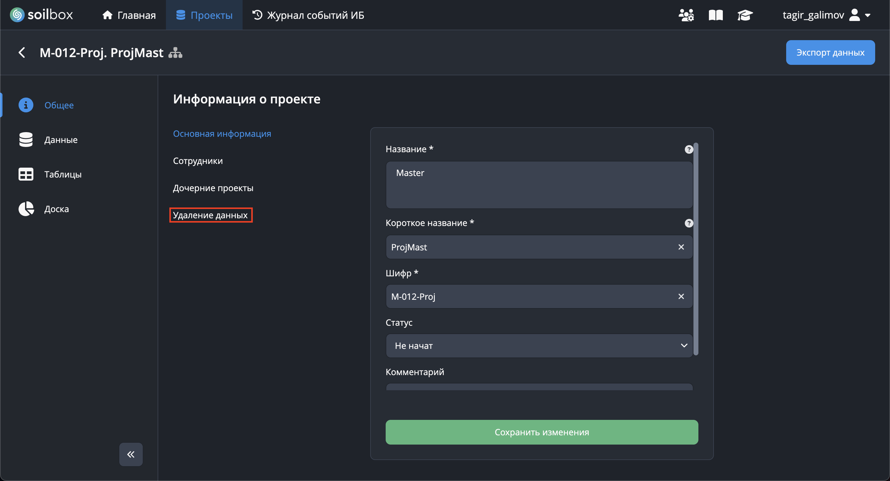 - Откройте вкладку «Удаление данных» и нажмите «Удалить мастер-проект».