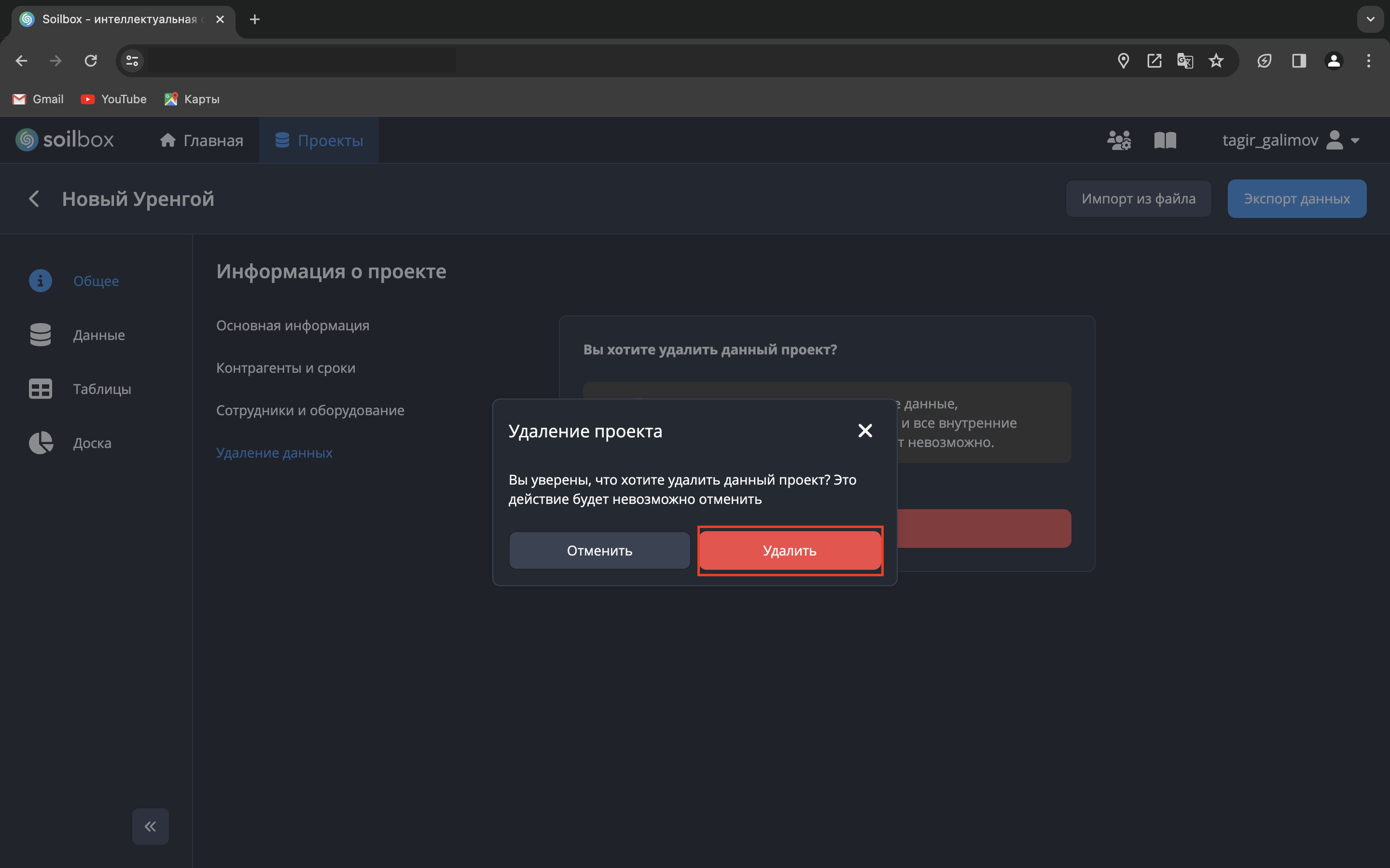 - Откройте вкладку «Удаление данных» и нажмите кнопку «Удалить проект».