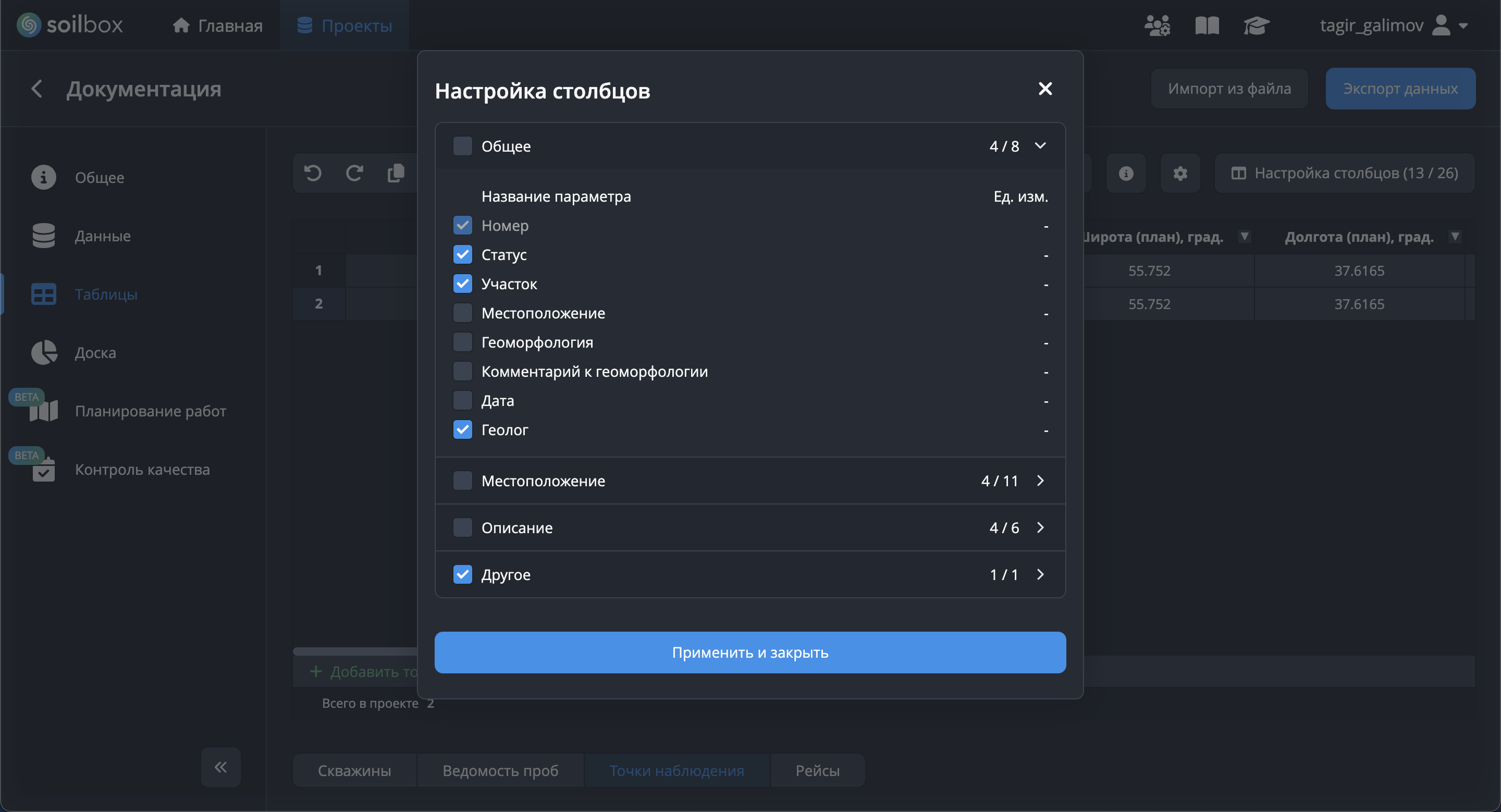 - Отметьте нужные параметры (например: Статус, Участок, Геолог, Широта (план), Долгота (план)).
