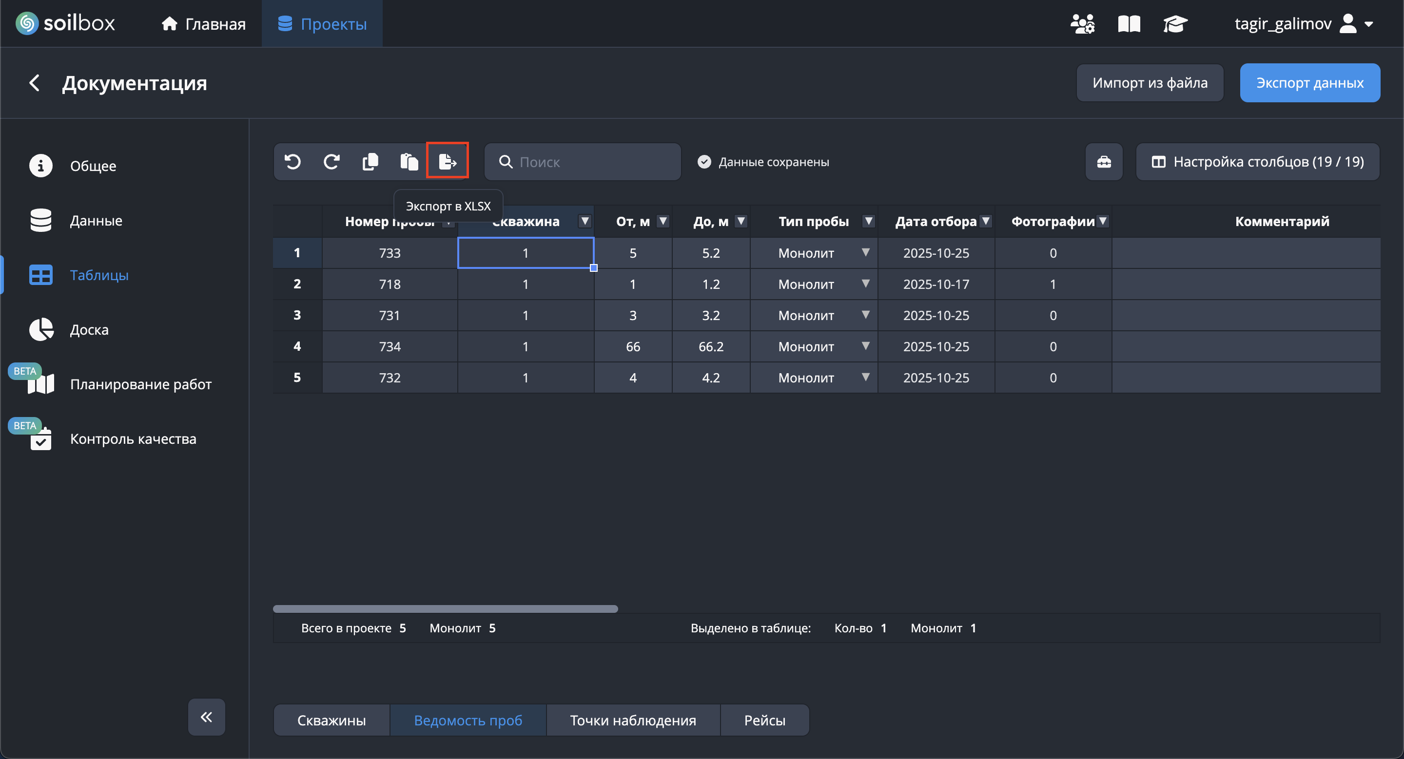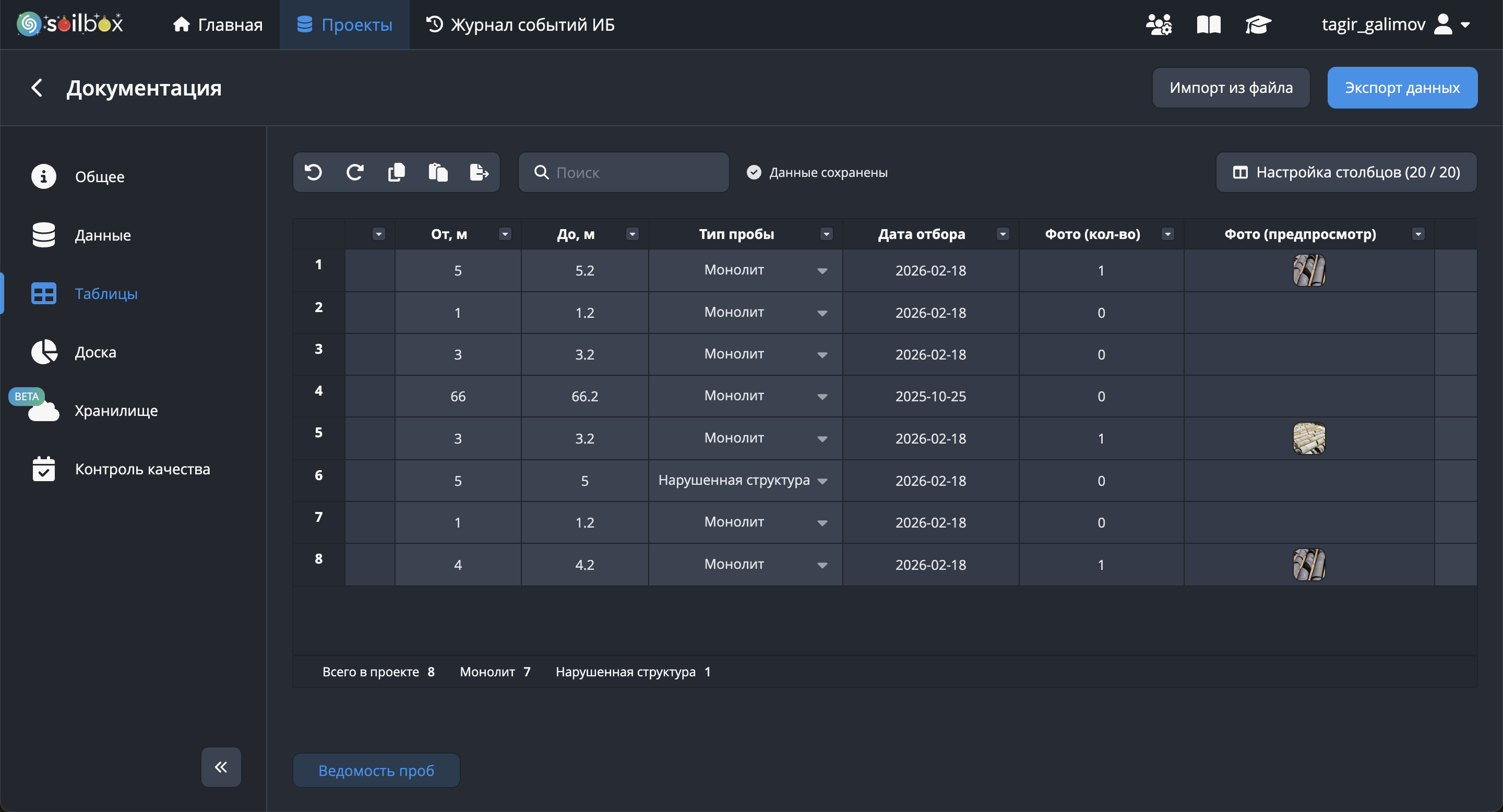 Раздел «Ведомость проб» предназначен для работы с информацией по всем пробам, отобранным в проекте. Каждая строка таблицы соответствует отдельной пробе, а каждый столбец — её параметру: номер, скважина, интервал отбора, тип, дата, фотографии, комментарий, полное описание, сокращенное описание, состояние, состояние мерзлого грунта, консистенция/водонасыщение, льдистость, плотность, содержание ов, карбонатность, ожелезненность.