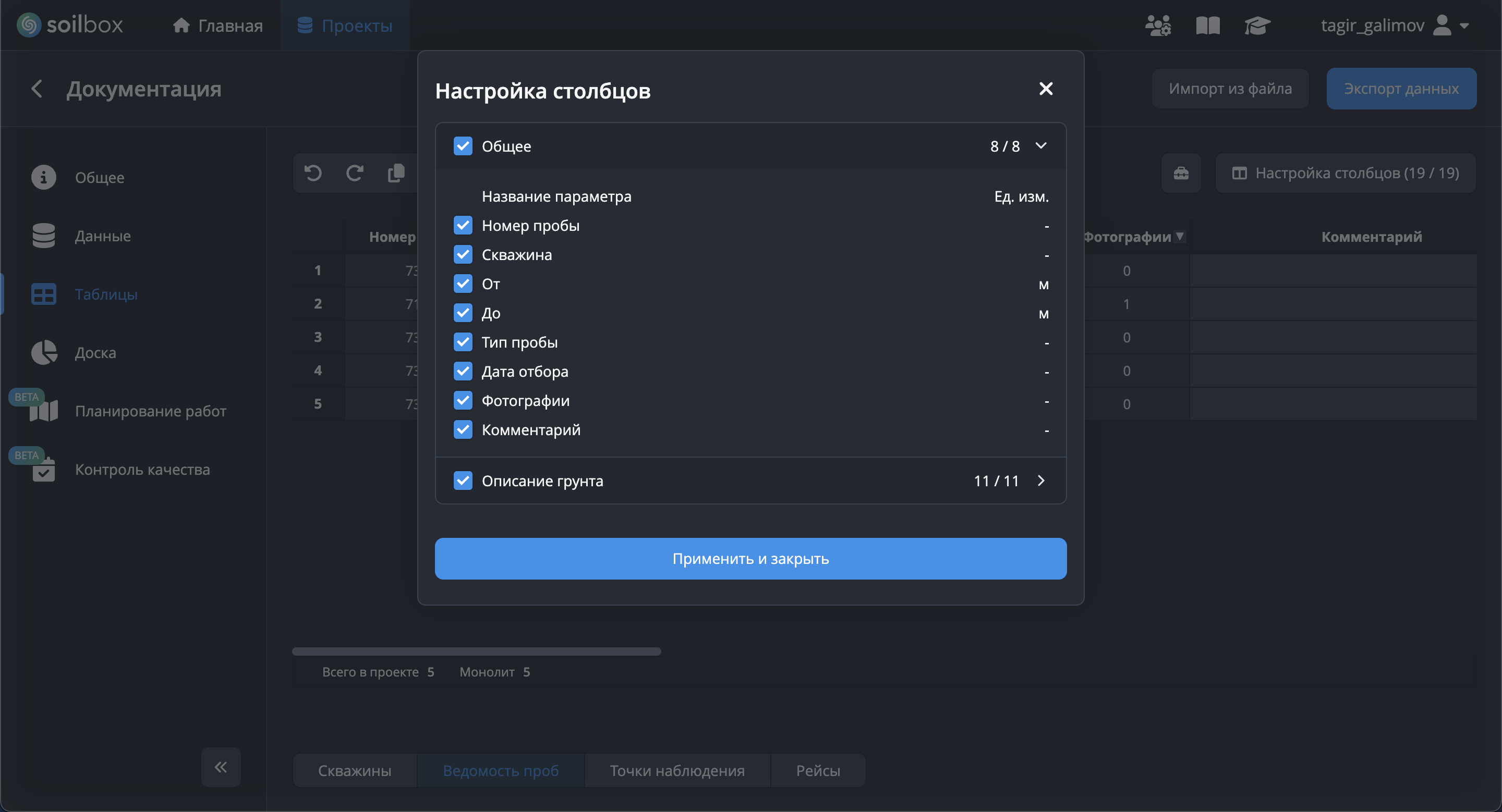 - Отметьте нужные атрибуты (например: Скважина, От, м, До, м, Тип пробы, Дата отбора, Фотографии, Комментарий).