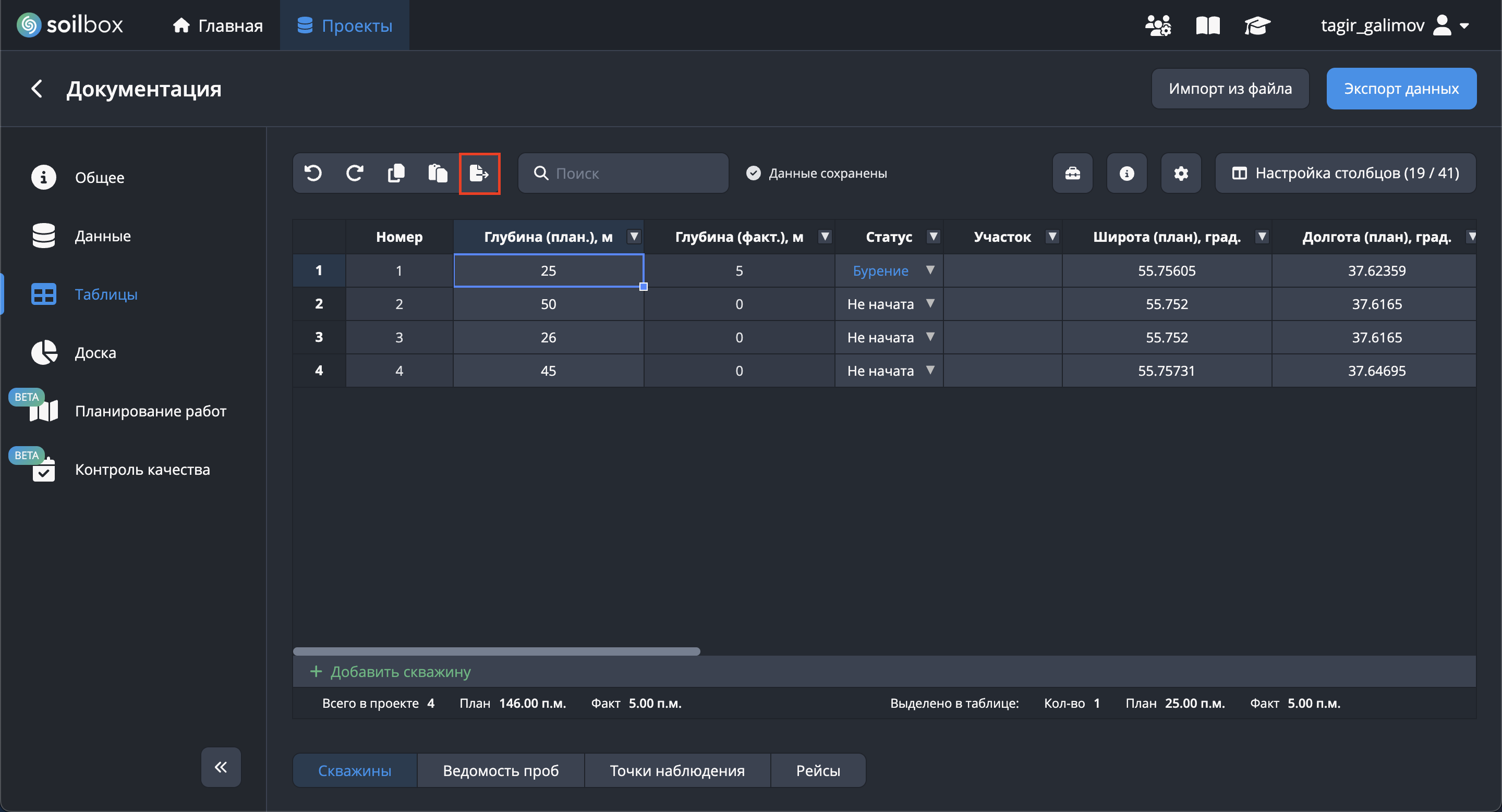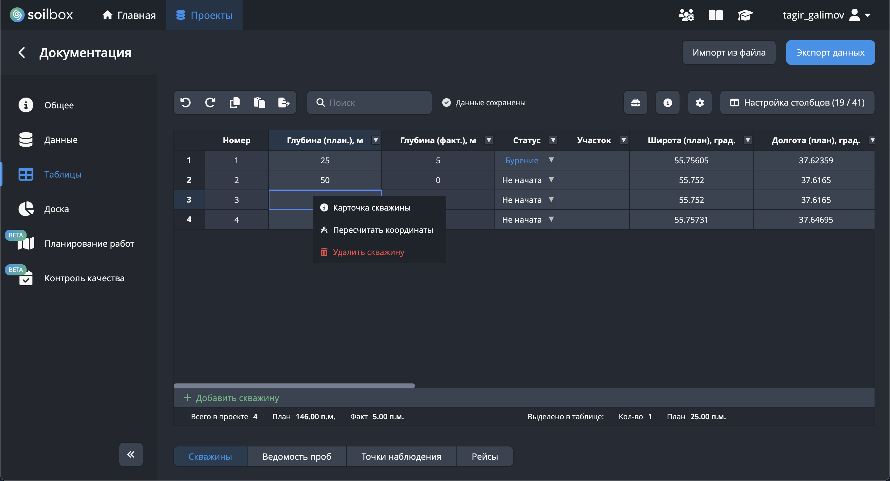«Таблицы» предназначены для получения аналитических срезов и сводных данных по атрибутам всех типов сущностей Soilbox, входящих в проекты. Администраторы могут также использовать «Таблицы» для пакетного редактирования атрибутов (как в Excel) — например, назначения новых координат, однотипных заданий по скважинам, уточнение геоморфологических элементов точек и пр.